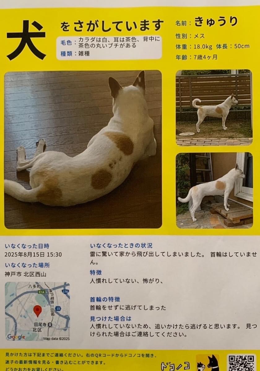 有馬警察署や保健所など届けていますが、臆病な犬ですので、保護する事は難しいかと思います。