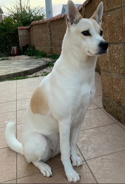 白がベースですが、薄い茶色のブチのある中型犬になります。耳は茶色です。現在首輪は、してません。