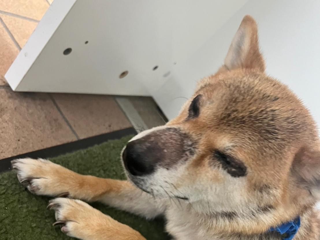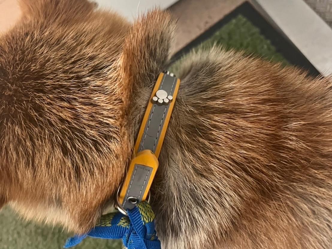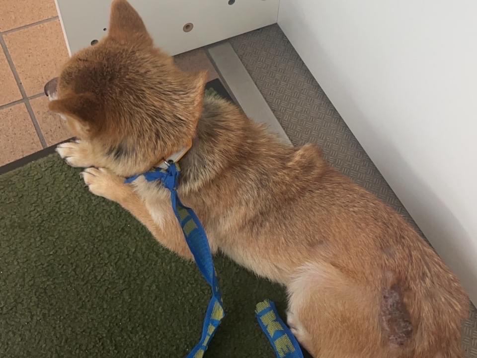 そこまで老犬ではなさそうですが皮膚病のような感じがします。人慣れしていて呼んだらきました。グレー&オレンジ、足型チャームのついた首輪をしてますが連絡先の記載はなかった。