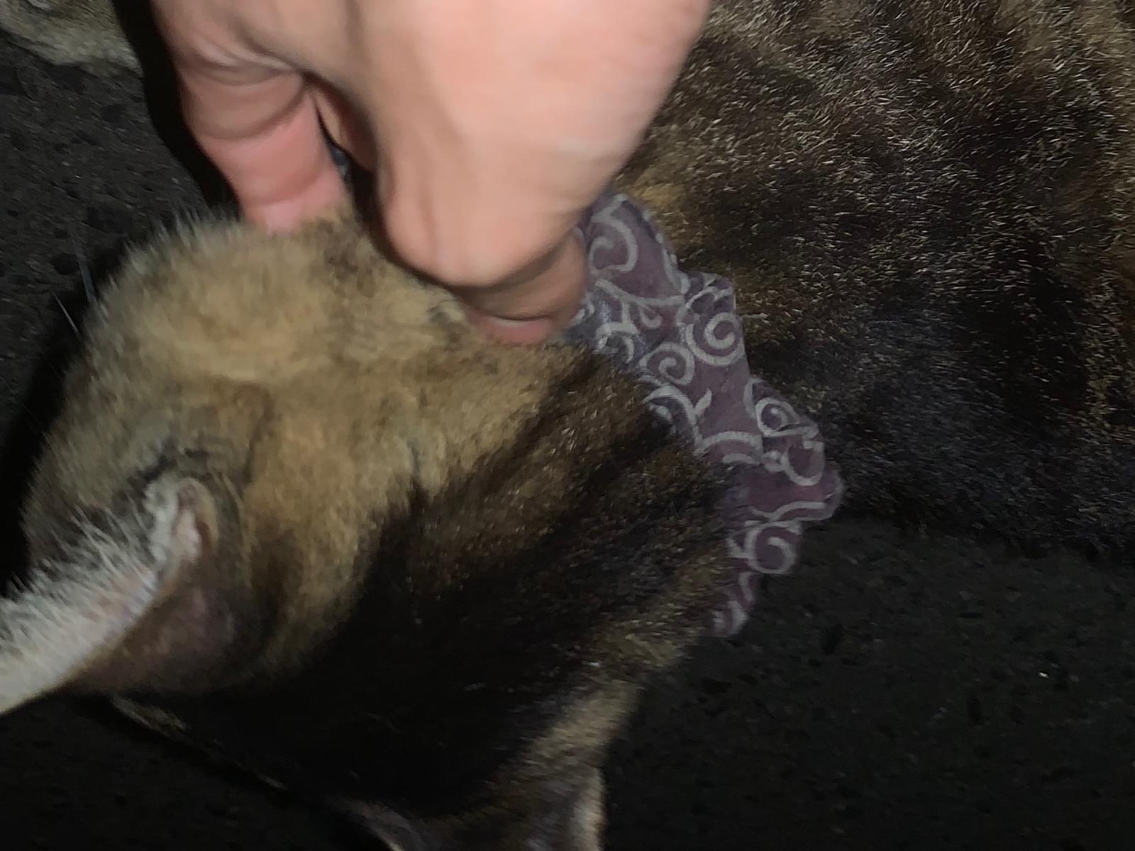 風呂敷のような柄のシュシュをつけていてそれにはリボンと鈴がついてました。すごく人間慣れしていました。
