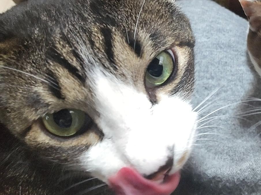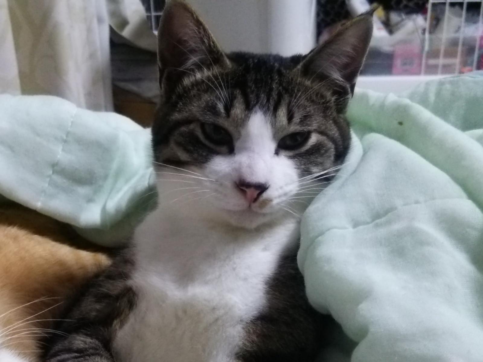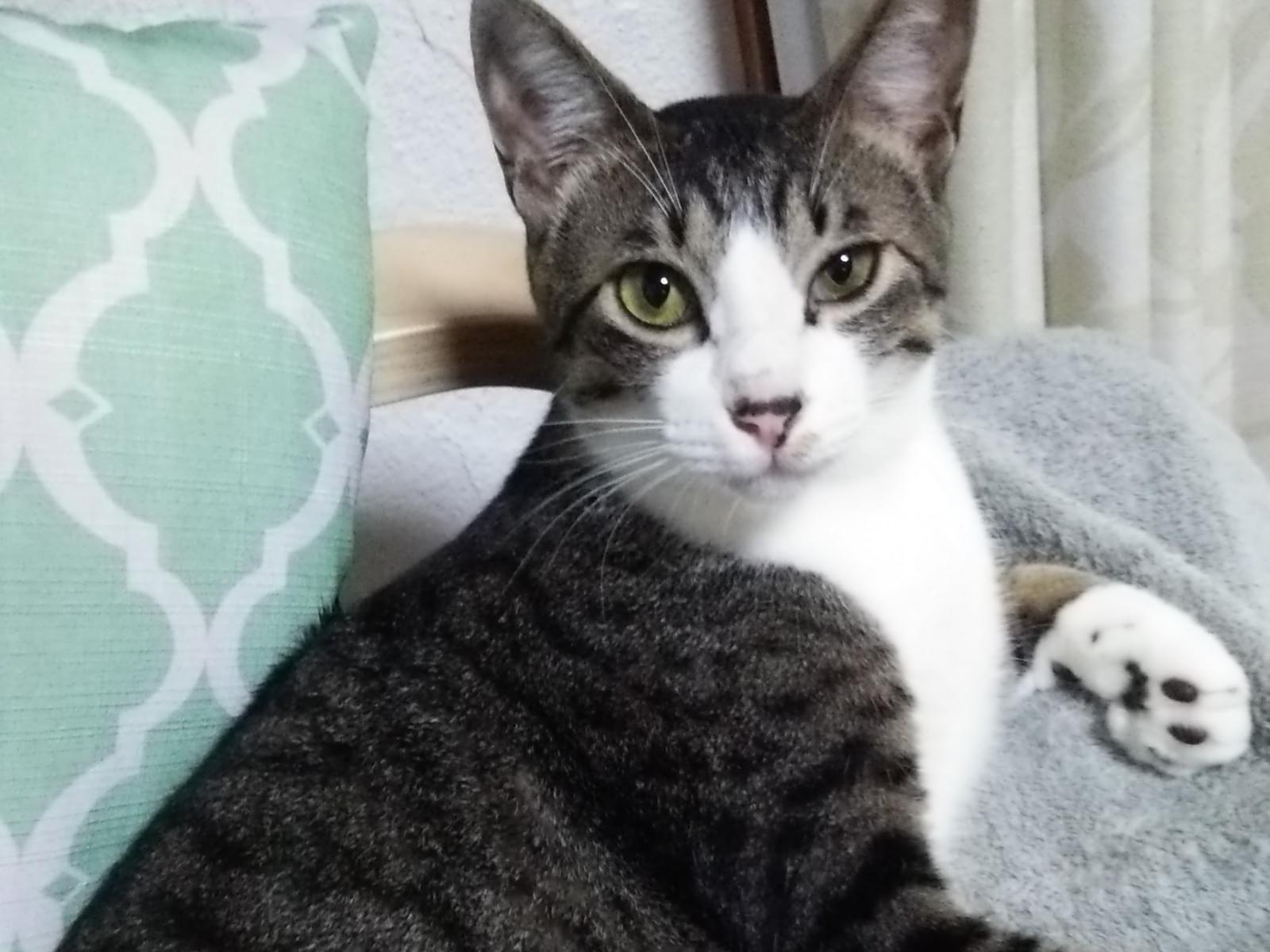 黒っぽいキジ白で左右対称な模様、足先は白の靴下にゃんこで、鼻の頭の黒い縁取りが特徴です。