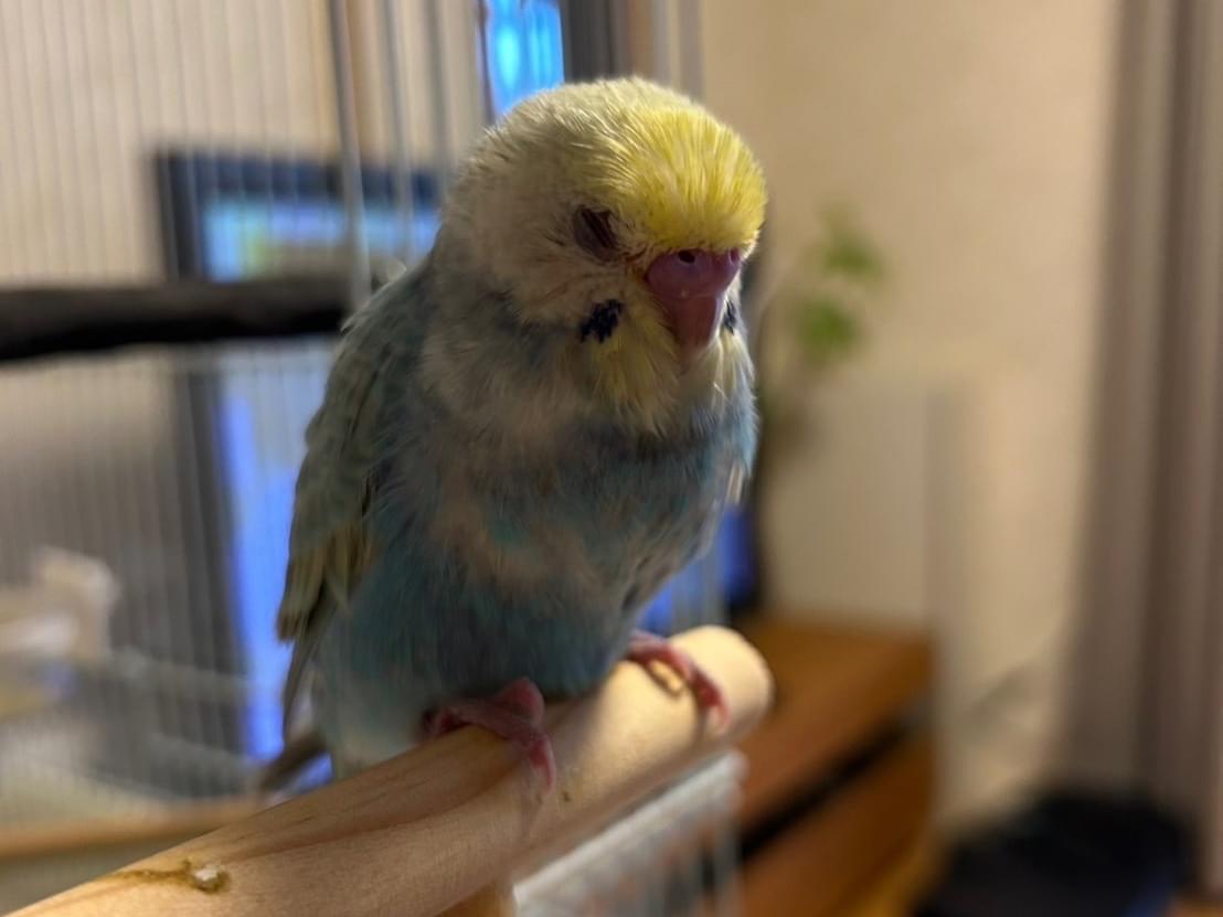 セキセイインコで頭が黄色、体が水色です。羽と尻尾の先がグレーで「リンちゃんかわいい」と喋ります。
