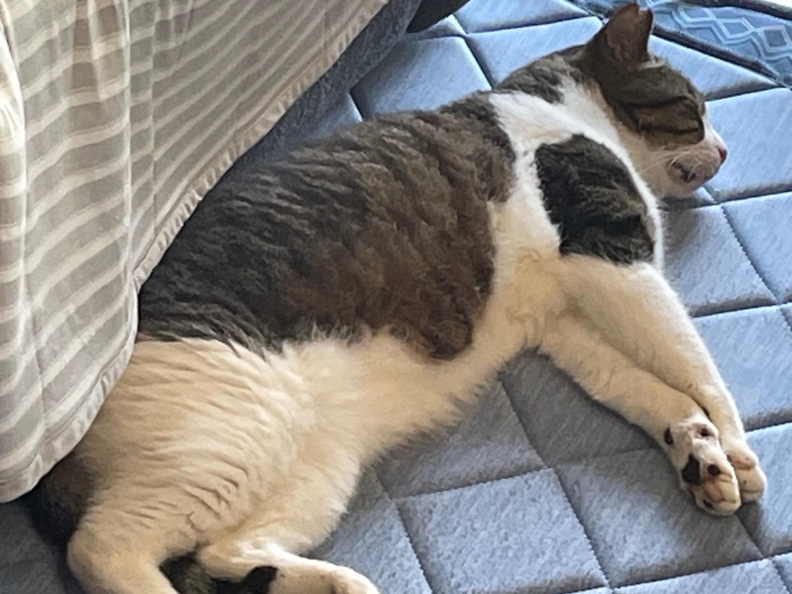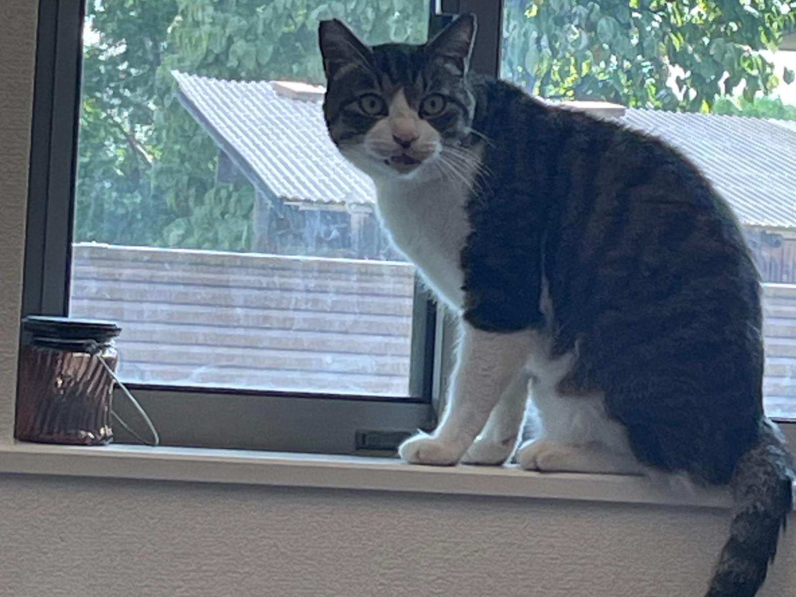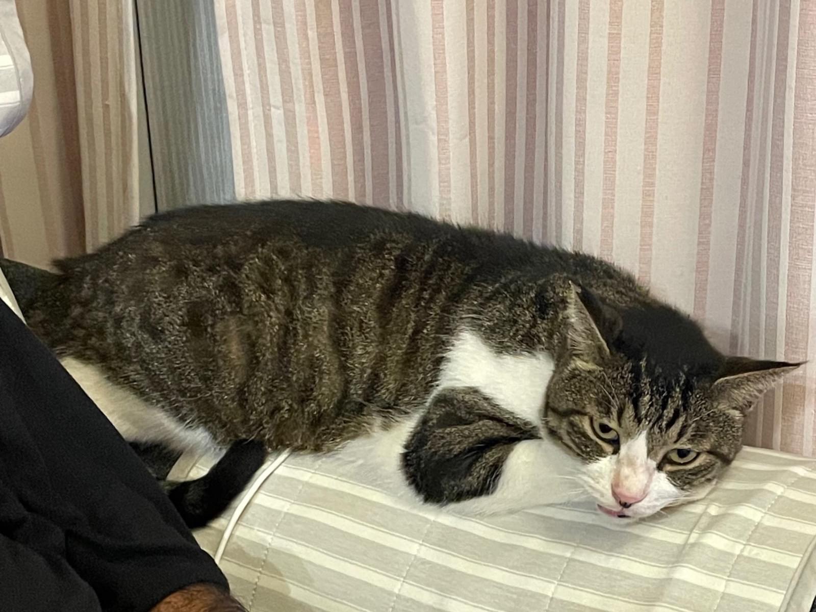 茶色に黒の模様、手足とお腹は白い大きな猫です。