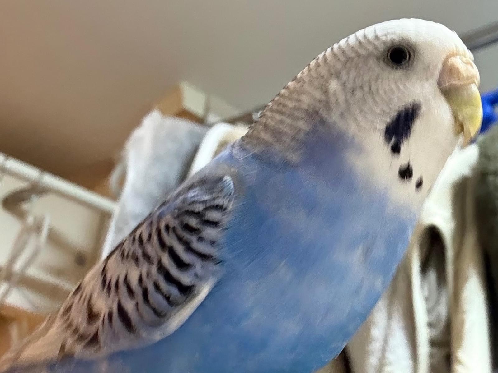 頭は白く、身体は水色で羽に黒が入って、足はピンク色です。顎の下ははっきりとした4つの黒点で、ほっぺは黒色です。