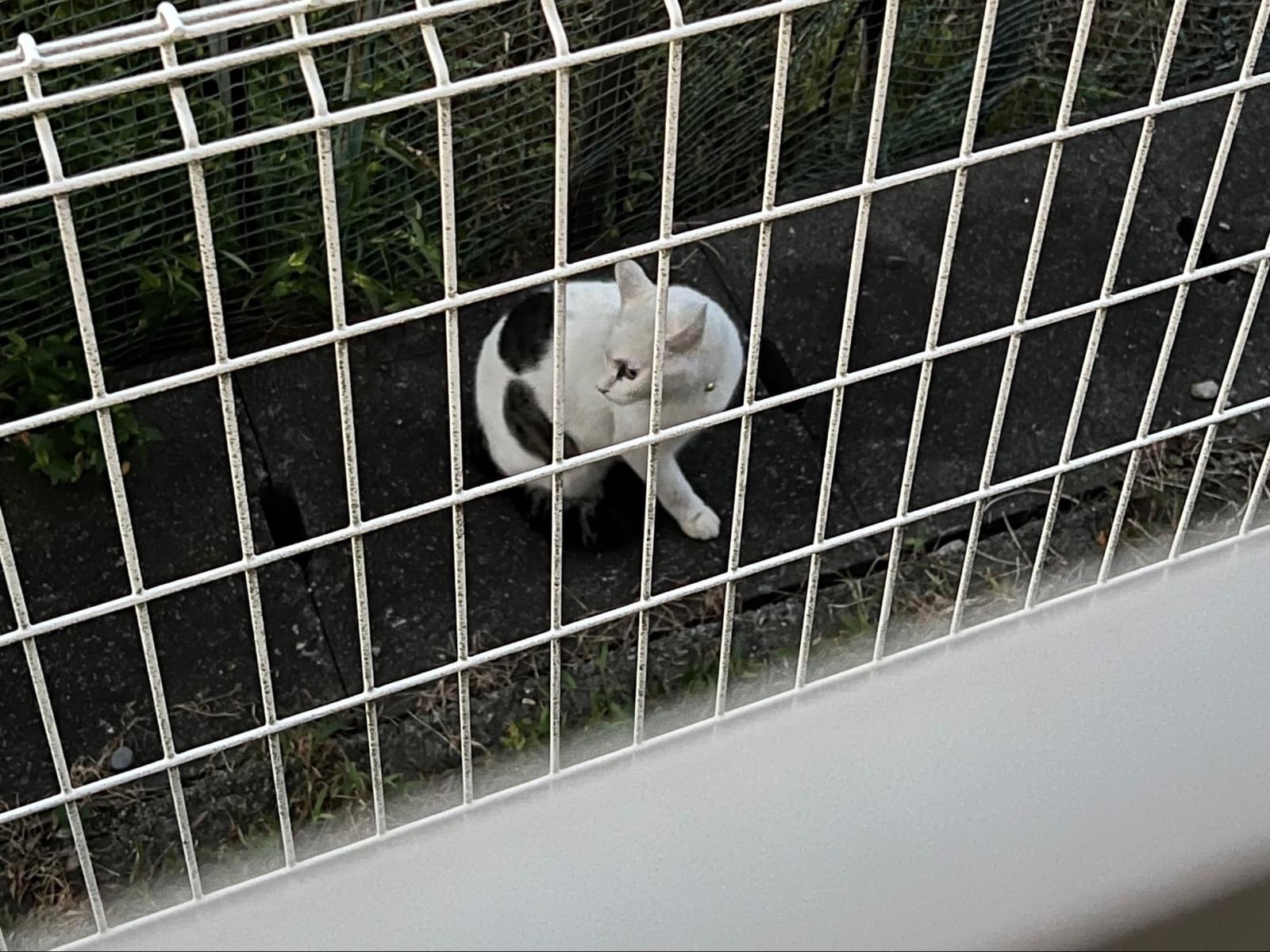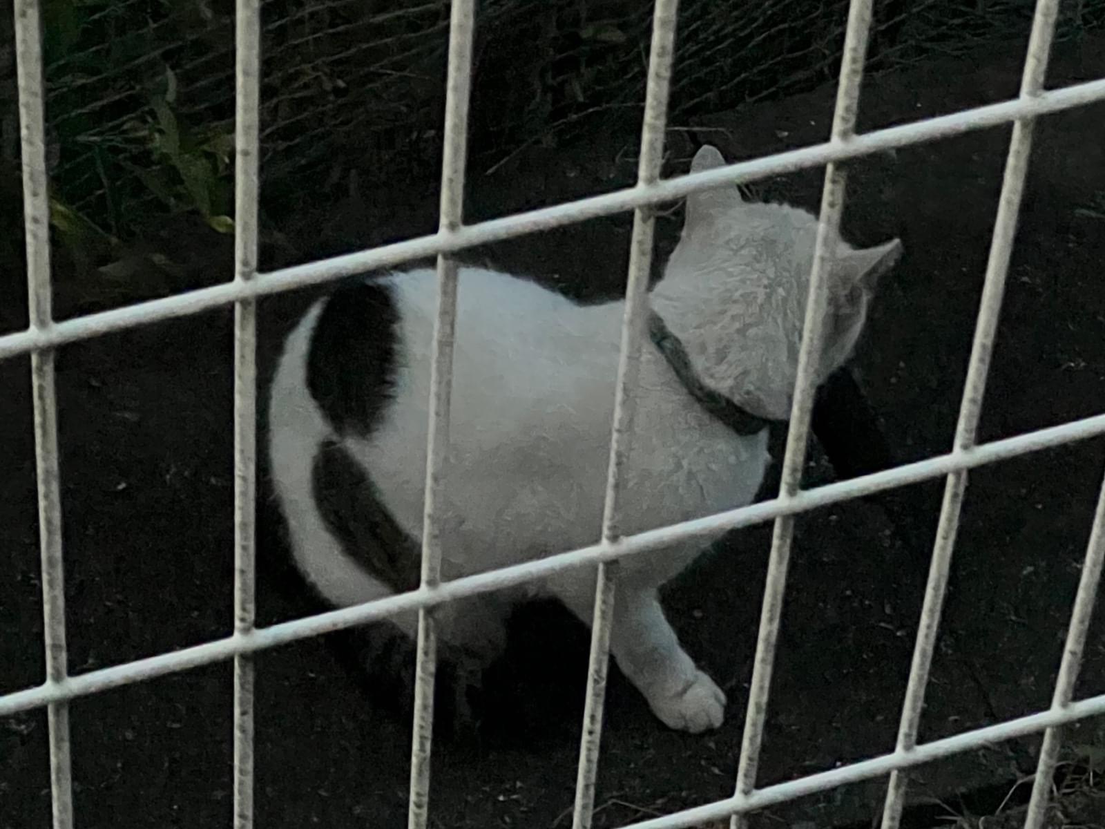 朝方鳴き声が聞こえるので窓を開けたところ、首輪をつけた白い(体に黒い模様あり)猫ちゃんがいました。そっと近づくと、警戒心が強いのか奥の梨園の方に逃げていってしまいました。
