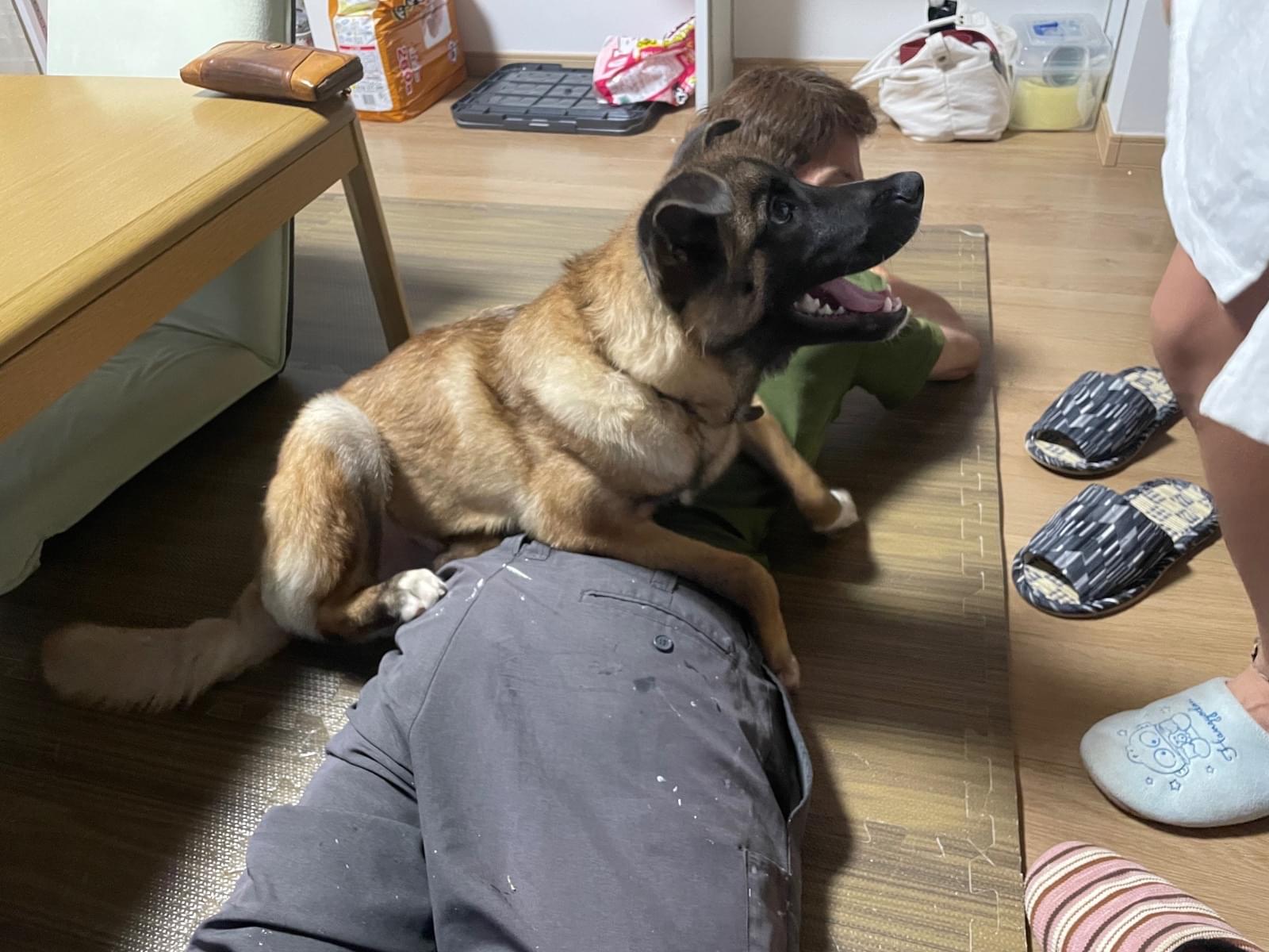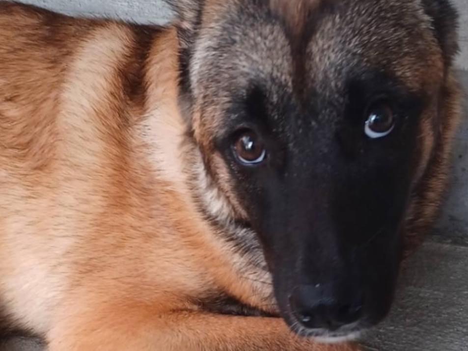 つぶらな瞳の顔の毛は黒く、茶黒白毛です。