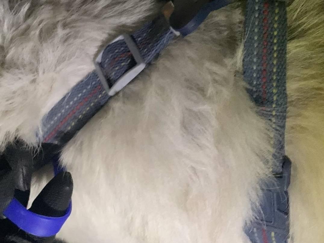 知り合いが岡山市南区浜野で青色のハーネスをつけた白犬を保護して、岡山南警察署に預けました。一定期間が過ぎたら保健所に行くそうです。ハーネスをしているので、飼い犬のはずです。