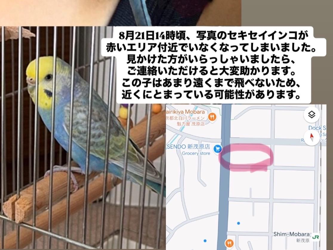 8月21日14時頃、写真のセキセイインコがいなくなってしまいました。