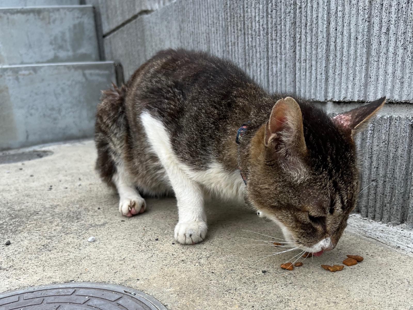 ネイビーのチロリンアンテープの首輪に白い鈴がついています。タグに携帯番号が書かれていたようですが、警戒心があり近づいては見れず。手持ちのカリカリを出したところ、寄ってきて少し食べました。