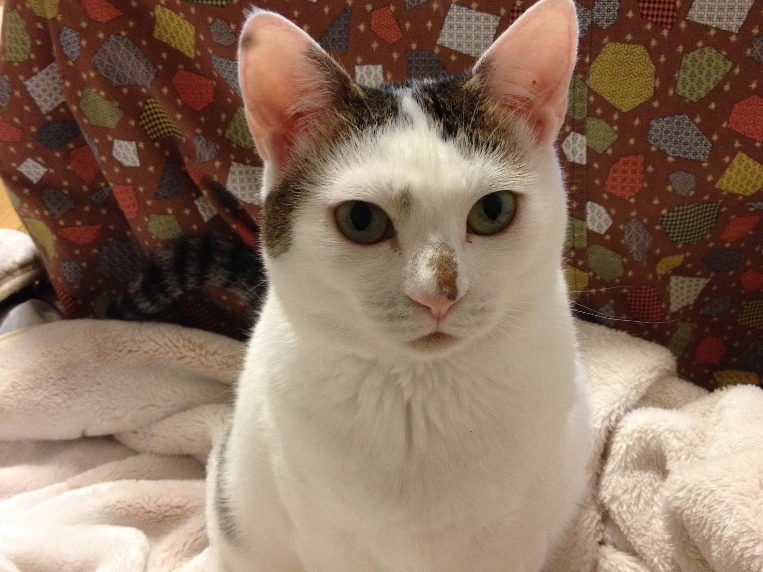 白い体で頭としっぽが黒いです。右脇腹に黒い模様があります。鼻に茶色い模様あります。