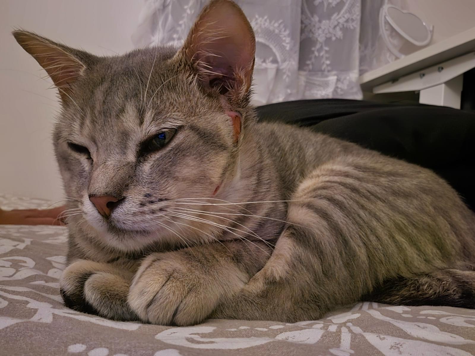 知らない人にでもお腹を触らせるような人慣れした子です。とてもいい子で大人しいですが、いきなり捕まえようとすると逃げるかもしれません。頭の右側に治療中のケガがあります。体重も5キロで大きめです。