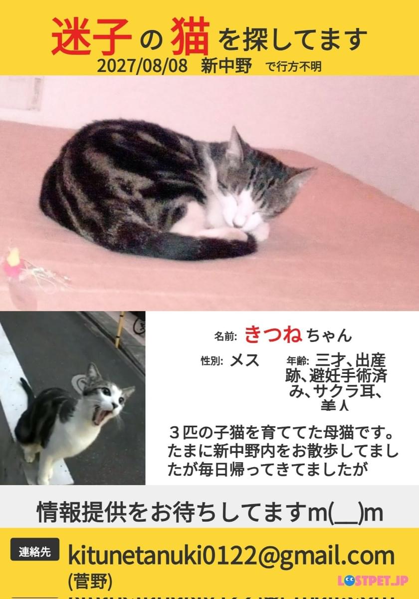 ホーム迷子猫東京都2歳のサバトラ探して…2歳のサバトラ探してます管理編集するポスター掲載終了最終更新日時:2025/09/01 21:37写真情報用件迷子名前きつね性別メス年齢2歳、サバトラ、サクラ耳、避妊手術済み場所東京都 中野区中央4丁目17-6発生日時2025年8月10日(日)飼い主菅野説明首輪なし 性格はクール 赤ちゃんから育てた大切な猫です子猫が3匹いて大好きなお母さんをずっと家で待ってます連絡先URL未設定掲示板情報交換のための掲示板です。ユーザーからの情報提供、オーナーからの連絡などにご利用下さいませ。まだコメントはありません。トピックを作成する