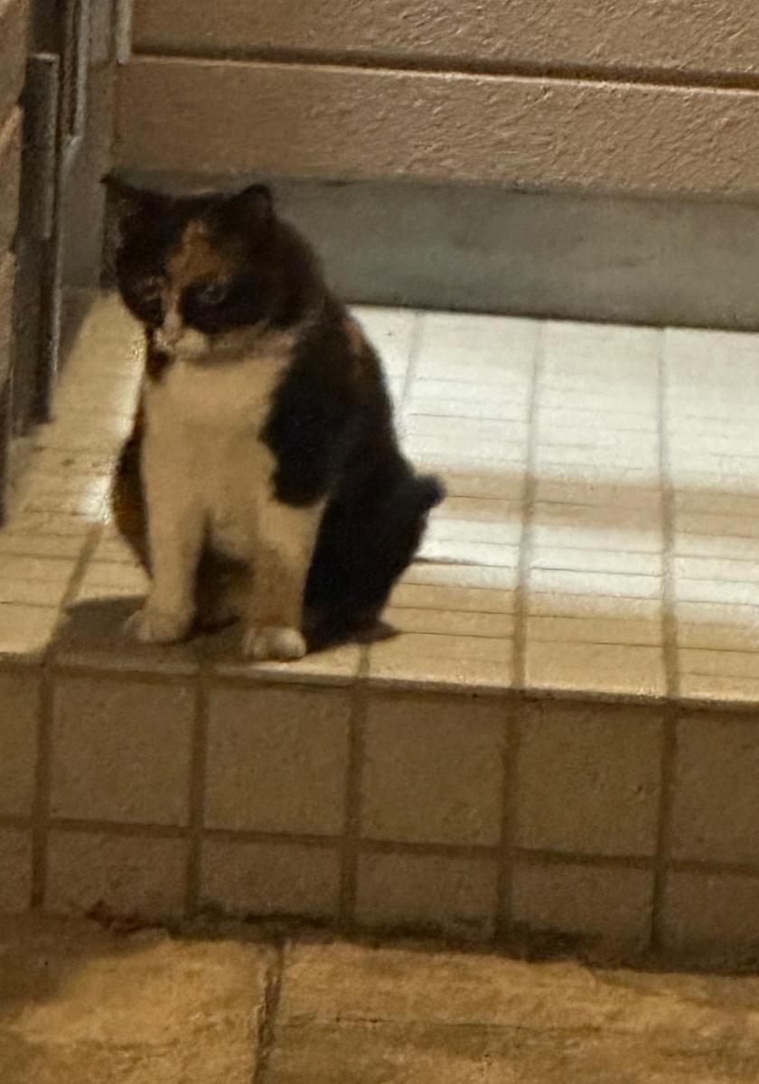 9月3日の夜中3時頃に三毛猫を見つけました。夜なので見にくいかもしれませんが、毛並みが綺麗でピンク色のような首輪が付いていました。ある程度近寄っても逃げていかず、話しかけるとよく耳を動かして聞いてくれました。