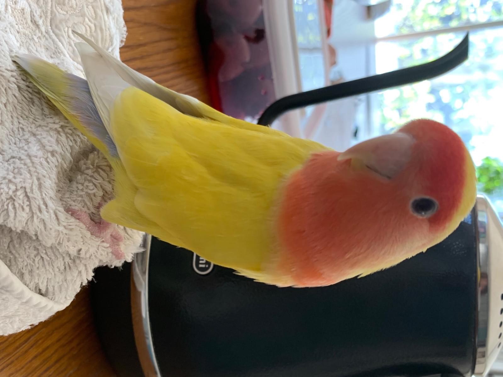 頭はオレンジ色で、背中に水色の羽が混ざってます。