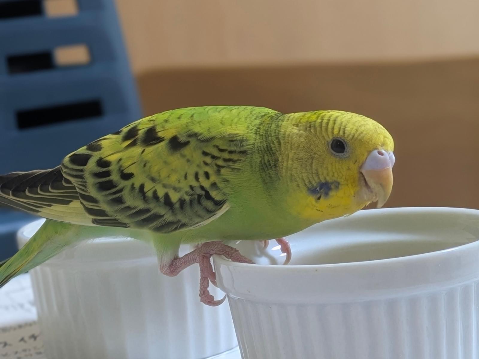 身体は黄緑と黄色、ほっぺは青、鼻は白い。小柄でまだ若く見えます。恐らくメスではないかと思われます。遊歩道で発見、少し逃げましたが指を出したら乗ってくれました。自宅では簡易カゴに入れましたが外に出たがり、出るとつかまえるのが困難です。自分からこちらには寄ってきません。たまにピチチと鳴きます。餌は良く食べてくれています。警察に届けを出しましたが、まだ問い合わせはありませんでした。