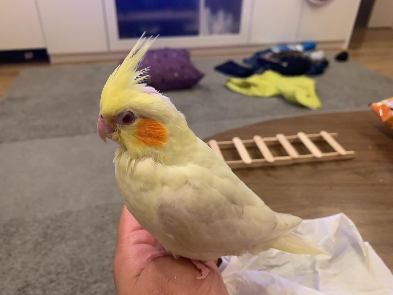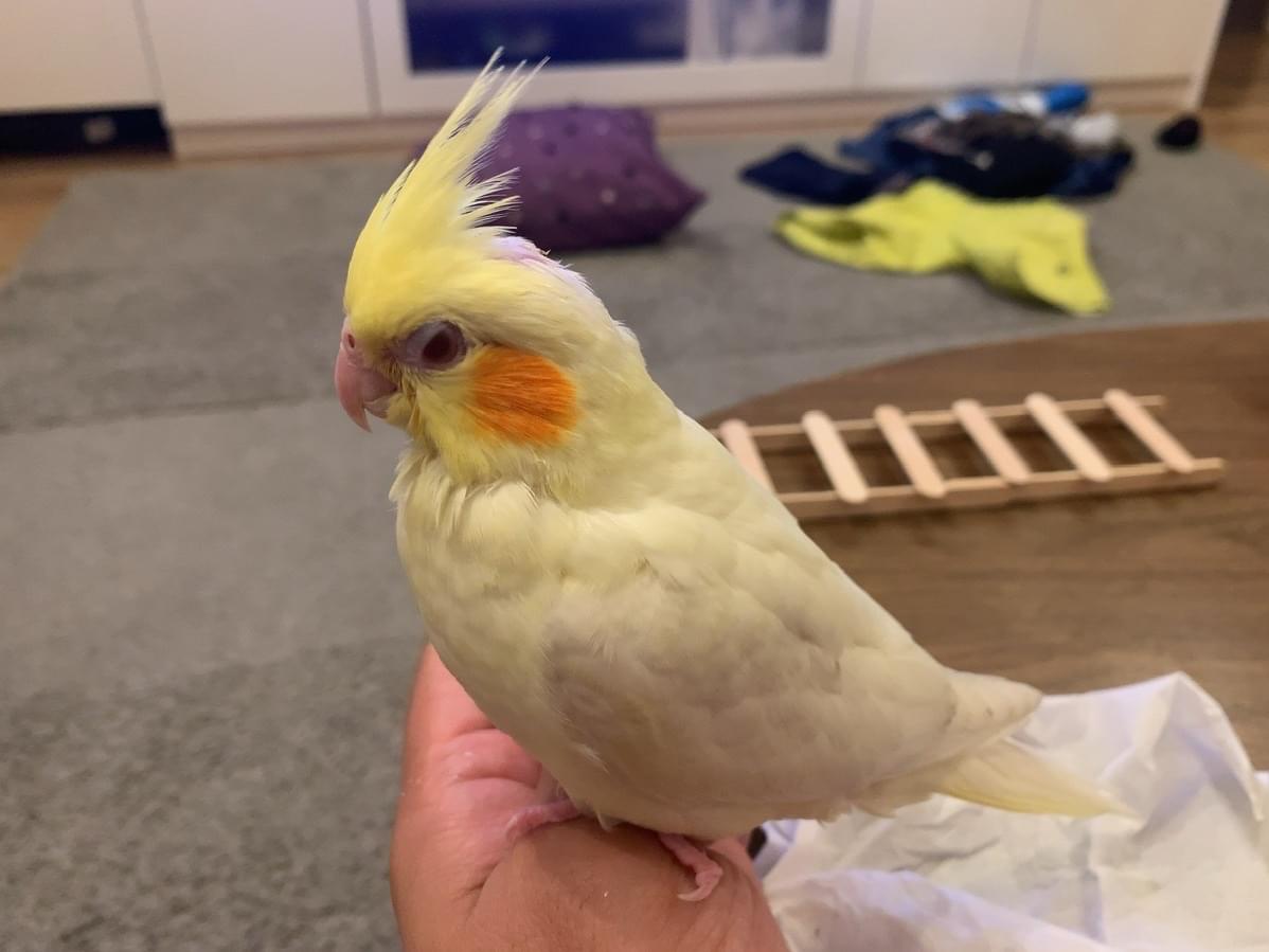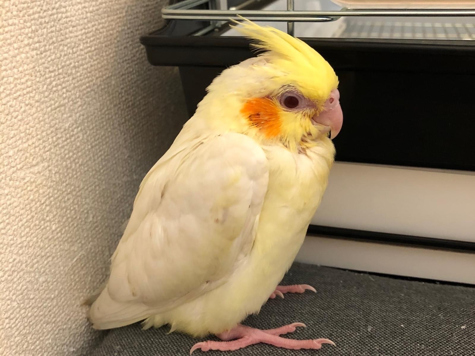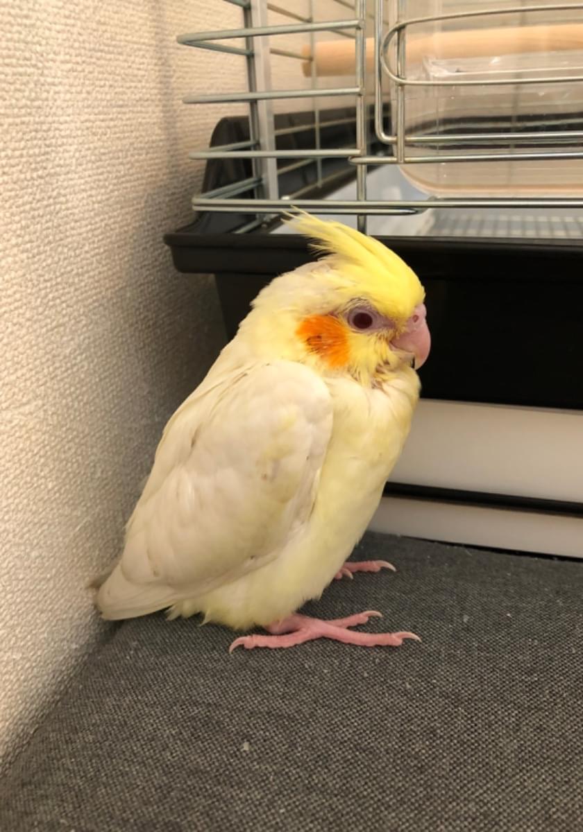 特徴は、一般的なルチノーなのですが、まだ1ヶ月ちょっとなので、キレイに羽が生え揃ってません。大人のオカメインコに比べて冠羽が短いです。
