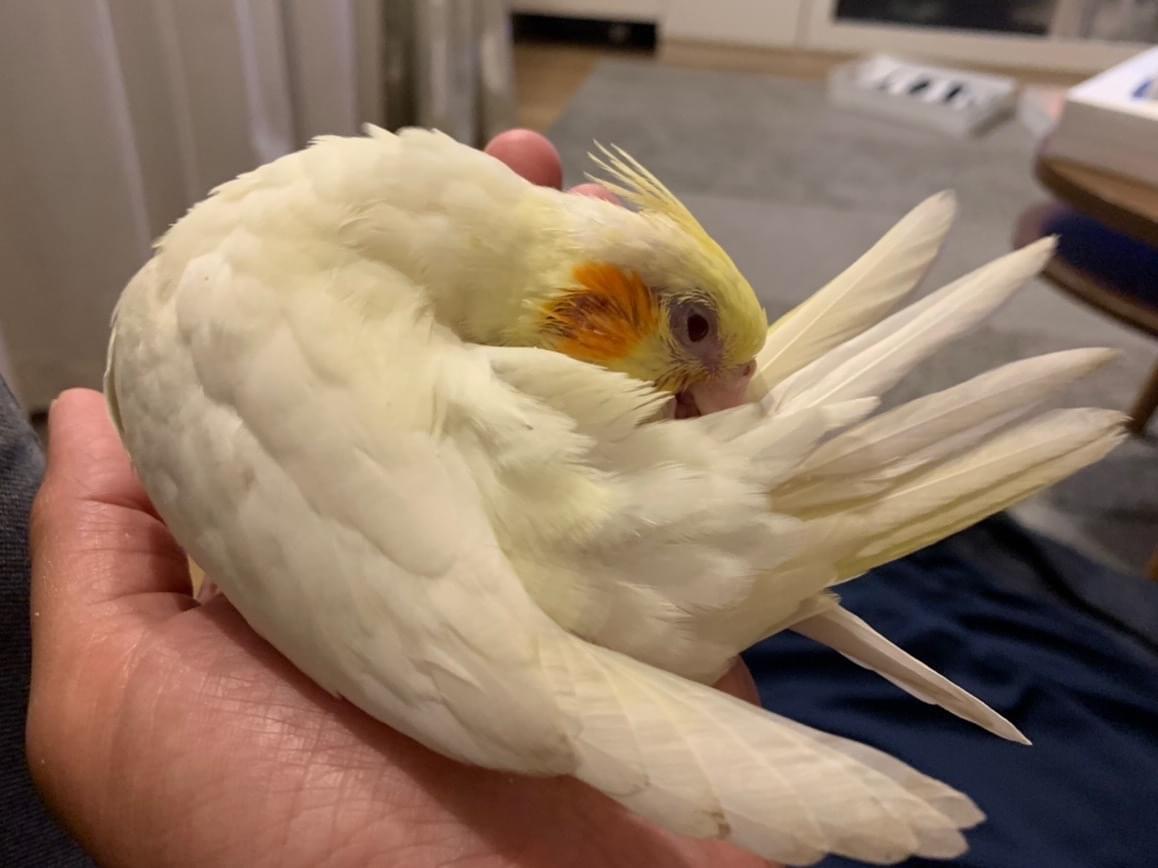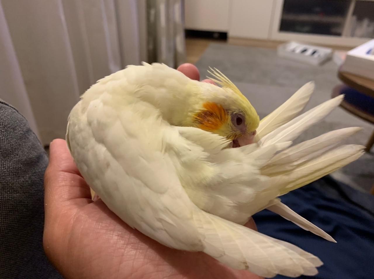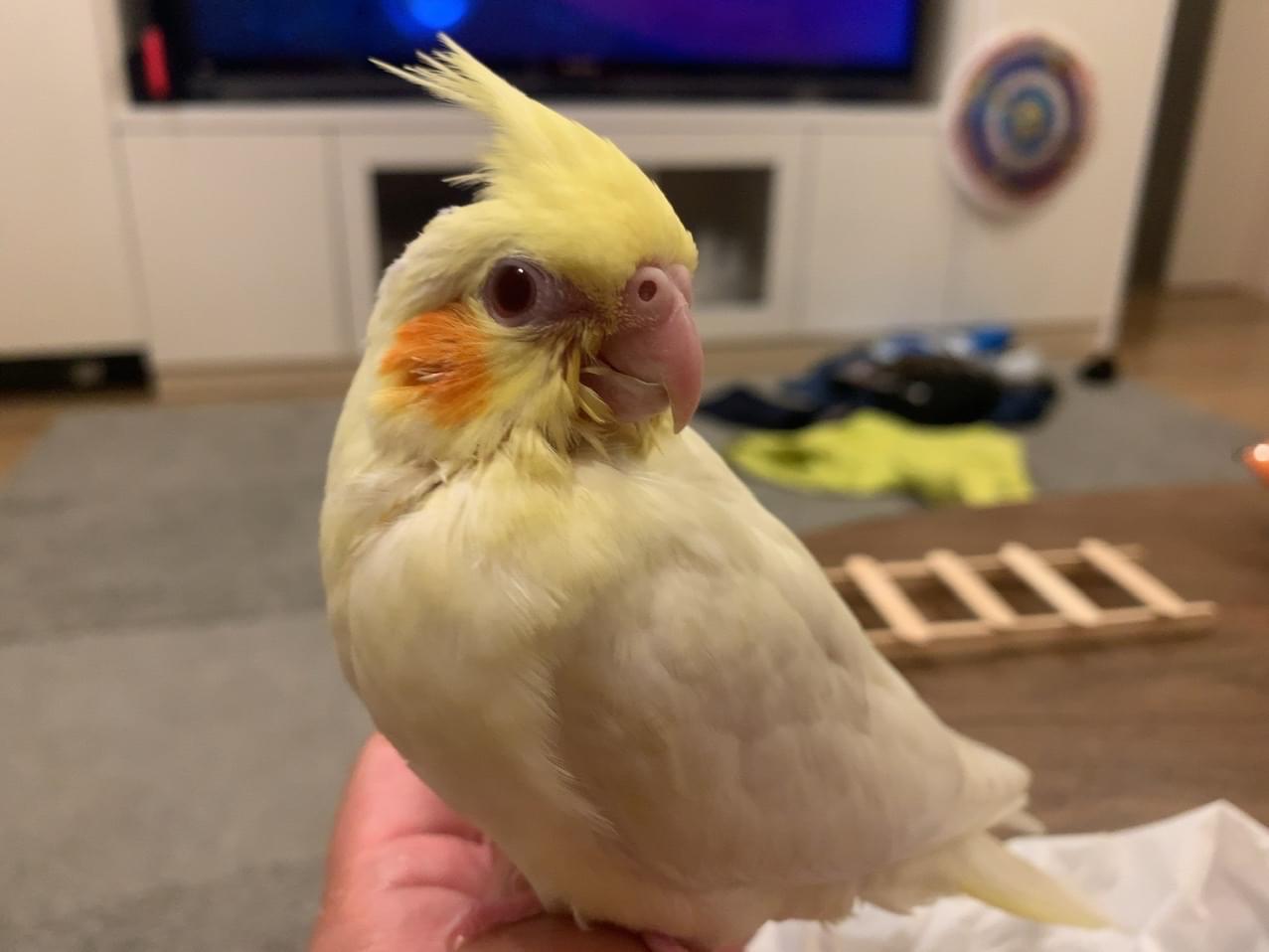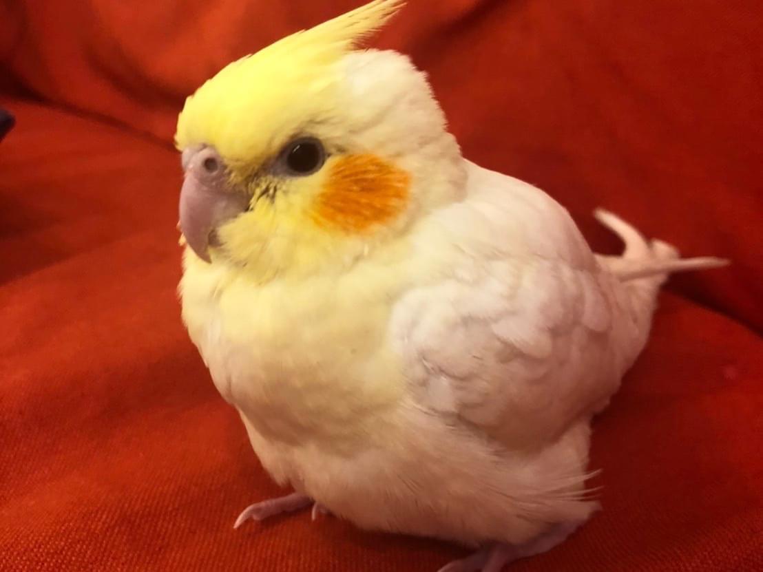 特徴は、一般的なルチノーなのですが、まだ1ヶ月ちょっとなので、キレイに羽が生え揃ってません。大人のオカメインコに比べて冠羽が短いです。