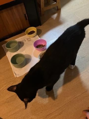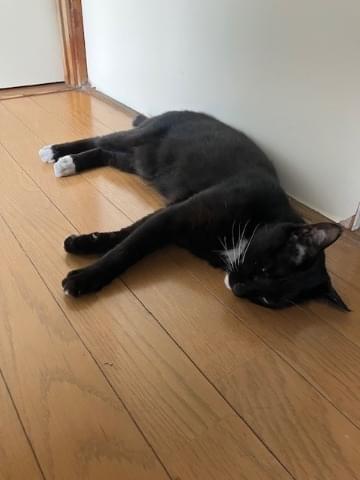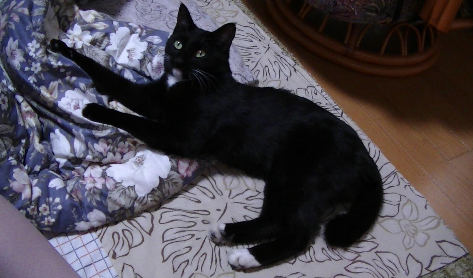 ほぼ黒い部分の多い、そろそろ9歳の飼い猫、体重3キロほどです。