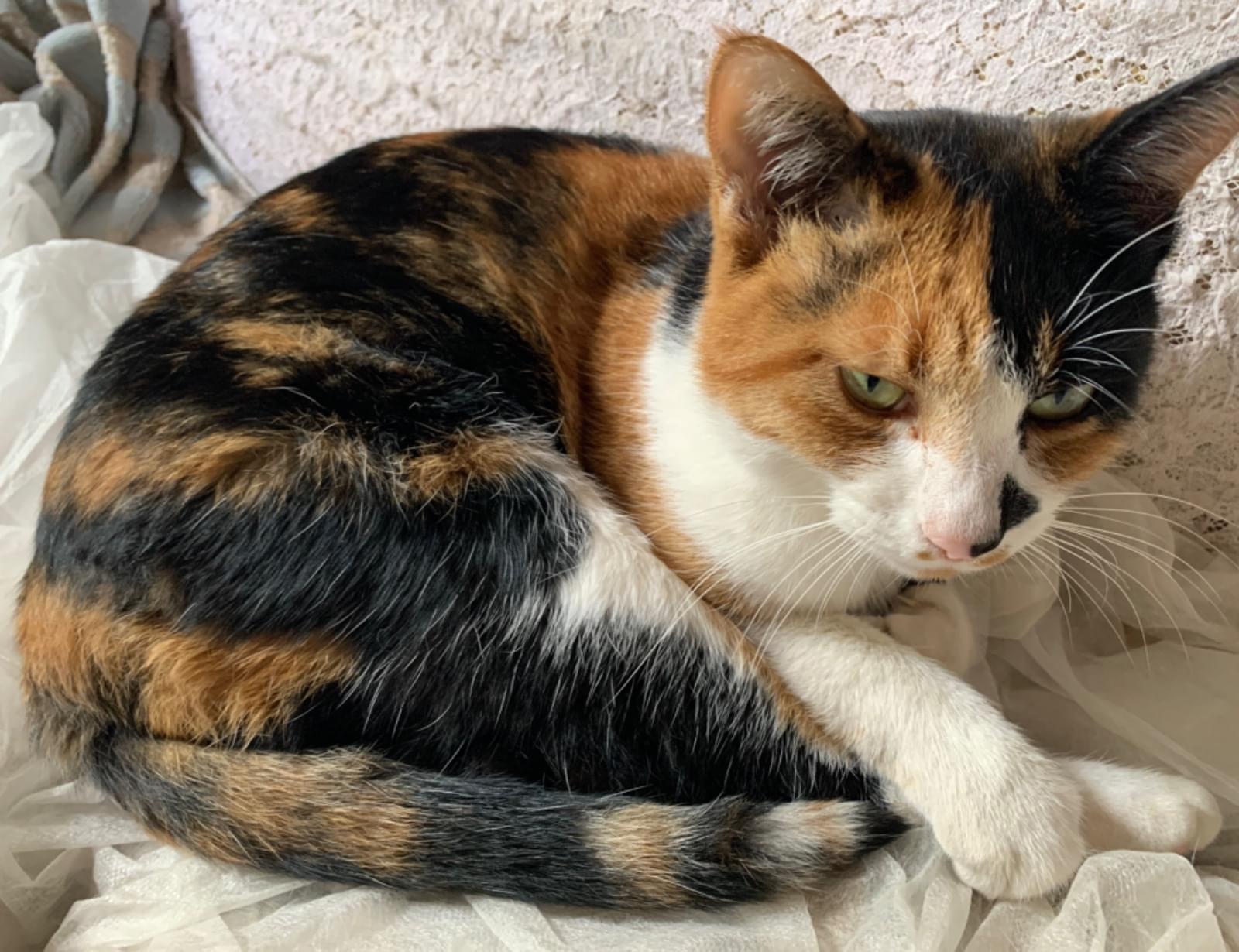 顔の鼻のそばにある牛柄が特徴的な、三毛猫の女の子です。人懐こく、とてもかわいい声で鳴きます。しっぽ長く、中型〜小柄の痩せ型。首輪はつけていません。家から出て10日以上戻ってこず、心配しています。些細な情報でもお寄せください。よろしくお願いいたします。