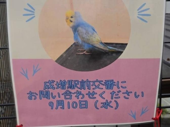 最寄りの交番、もしくは所轄の高島平警察署、会計課に9月10日に届けが出ているセキセイインコでお問い合わせください。