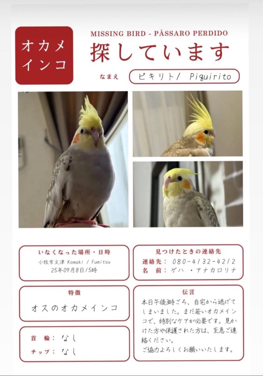 本日午後3時ごろ、自宅から逃げてしまいました。まだ若いオカメインコで、特別なケアが必要です。見かけた方や保護された方は、至急ご連絡ください。