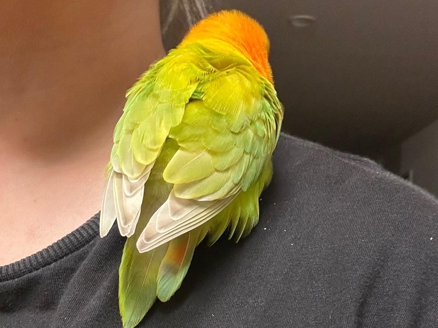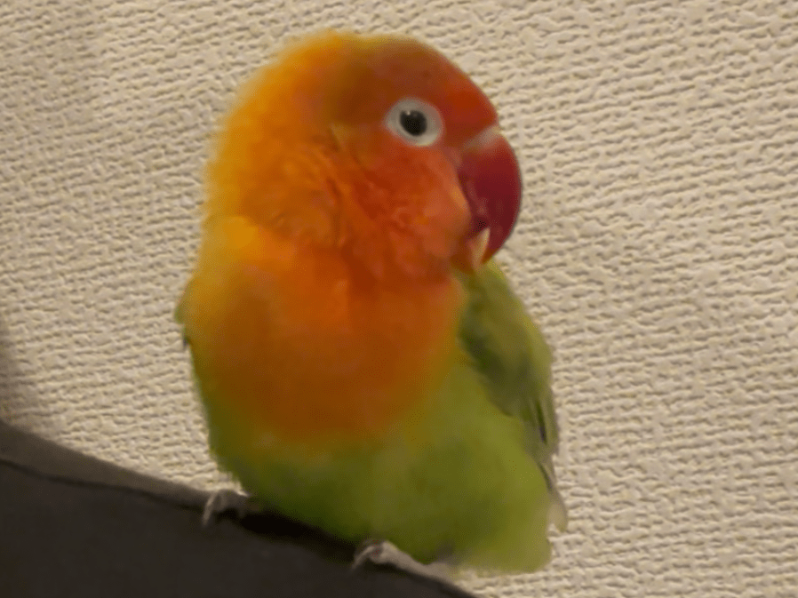 頭がオレンジ色、羽は黄緑色、足は白、クチバシは赤。
