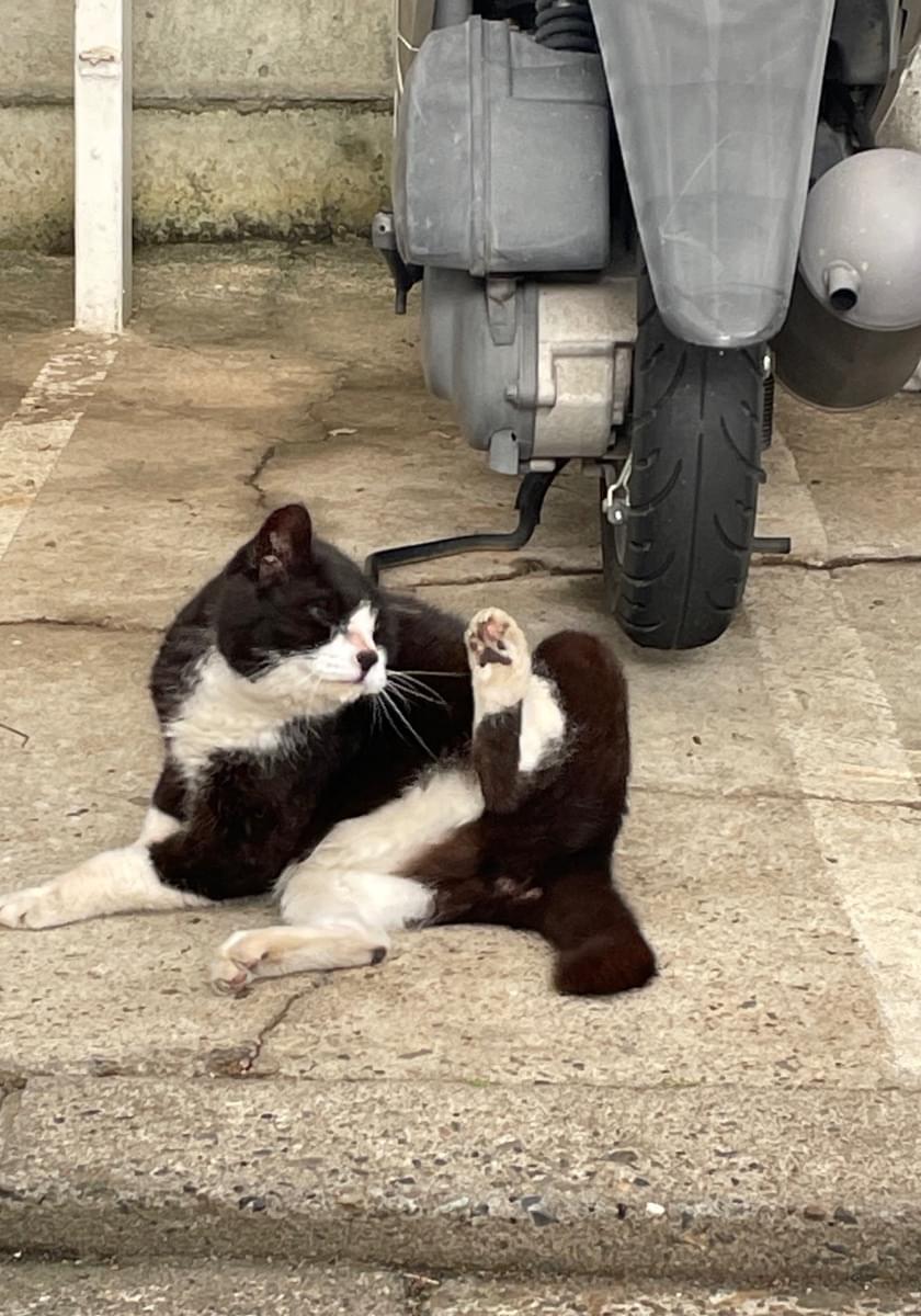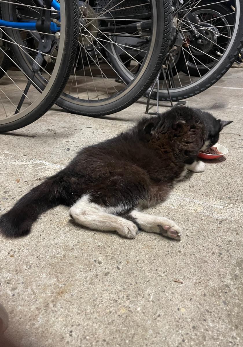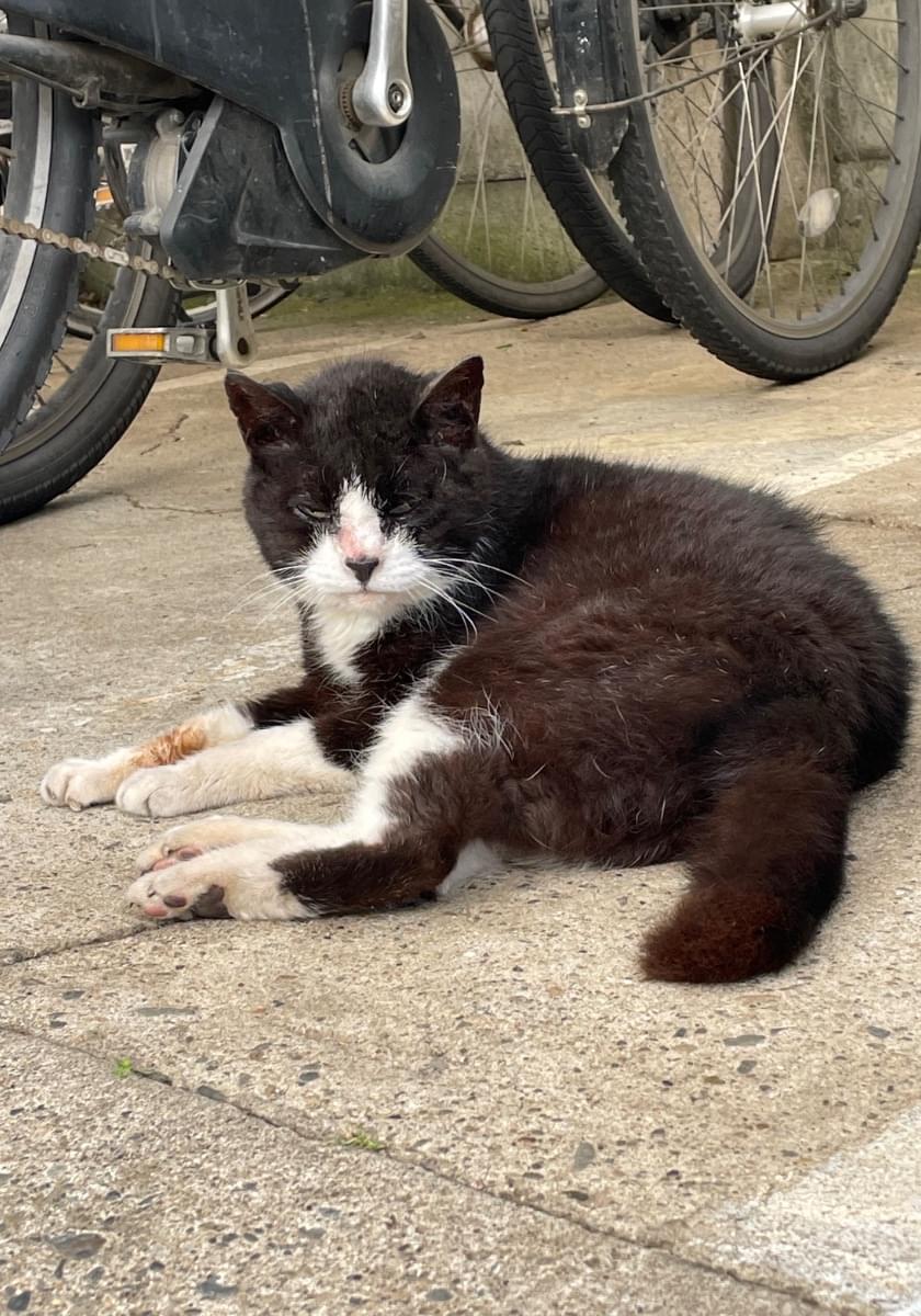 ハチワレ、首輪なし、ソックスを履いた様な白い足、尻尾は半分くらいの長さで太く黒色です。寝ている姿を後ろから見ると黒猫に見えます。怖くてワーワー鳴くことがあります。