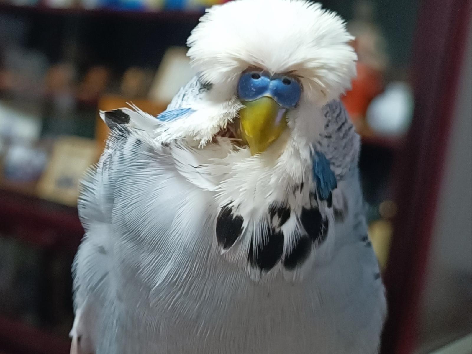 白い大きなおでこが特徴のジャンボセキセイインコを探しています。