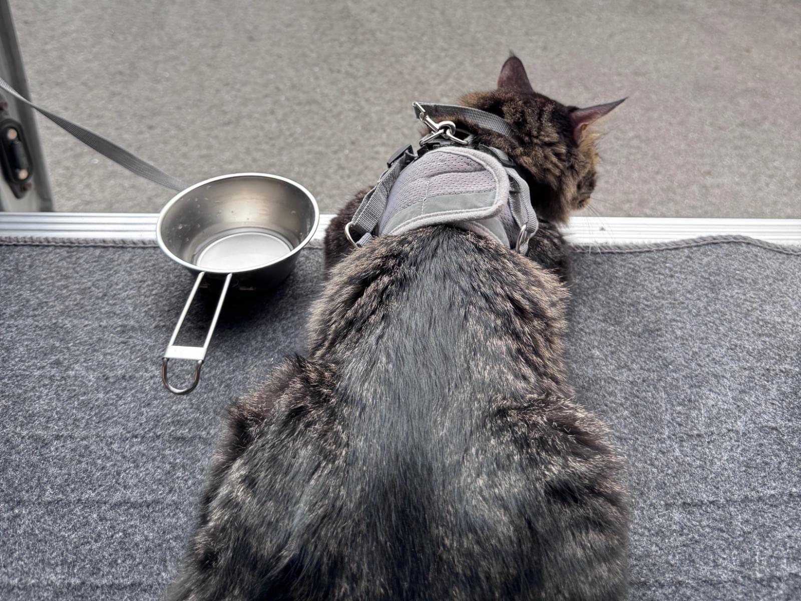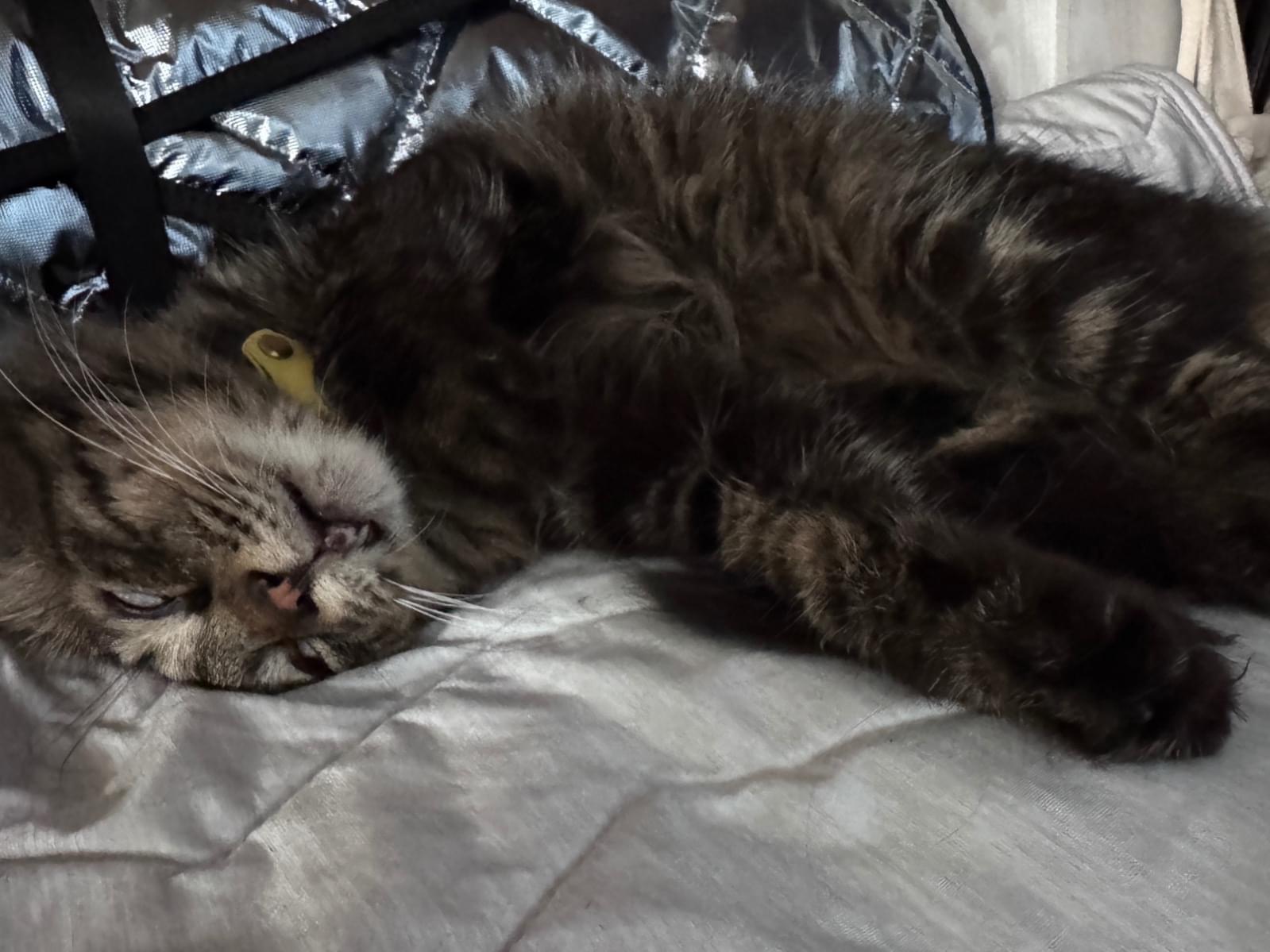 キジトラ長毛で黄色い首輪をしている臆病猫です