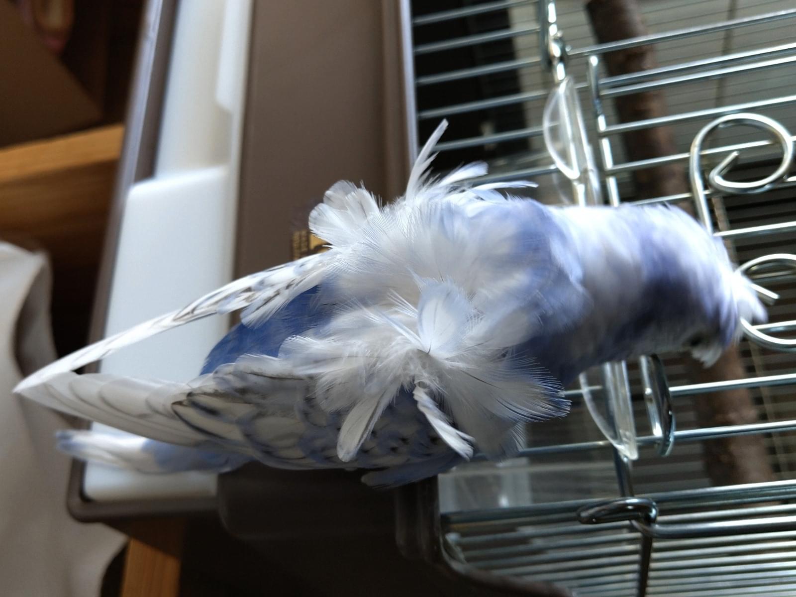 ハゴロモセキセイインコ、背中がブルー頭とお腹が白です。人の手は怖がりません。お話はしませんがぴぃちゃ