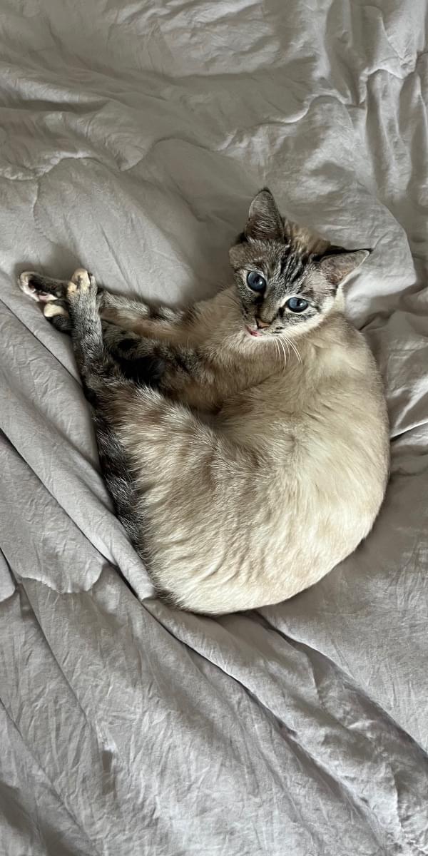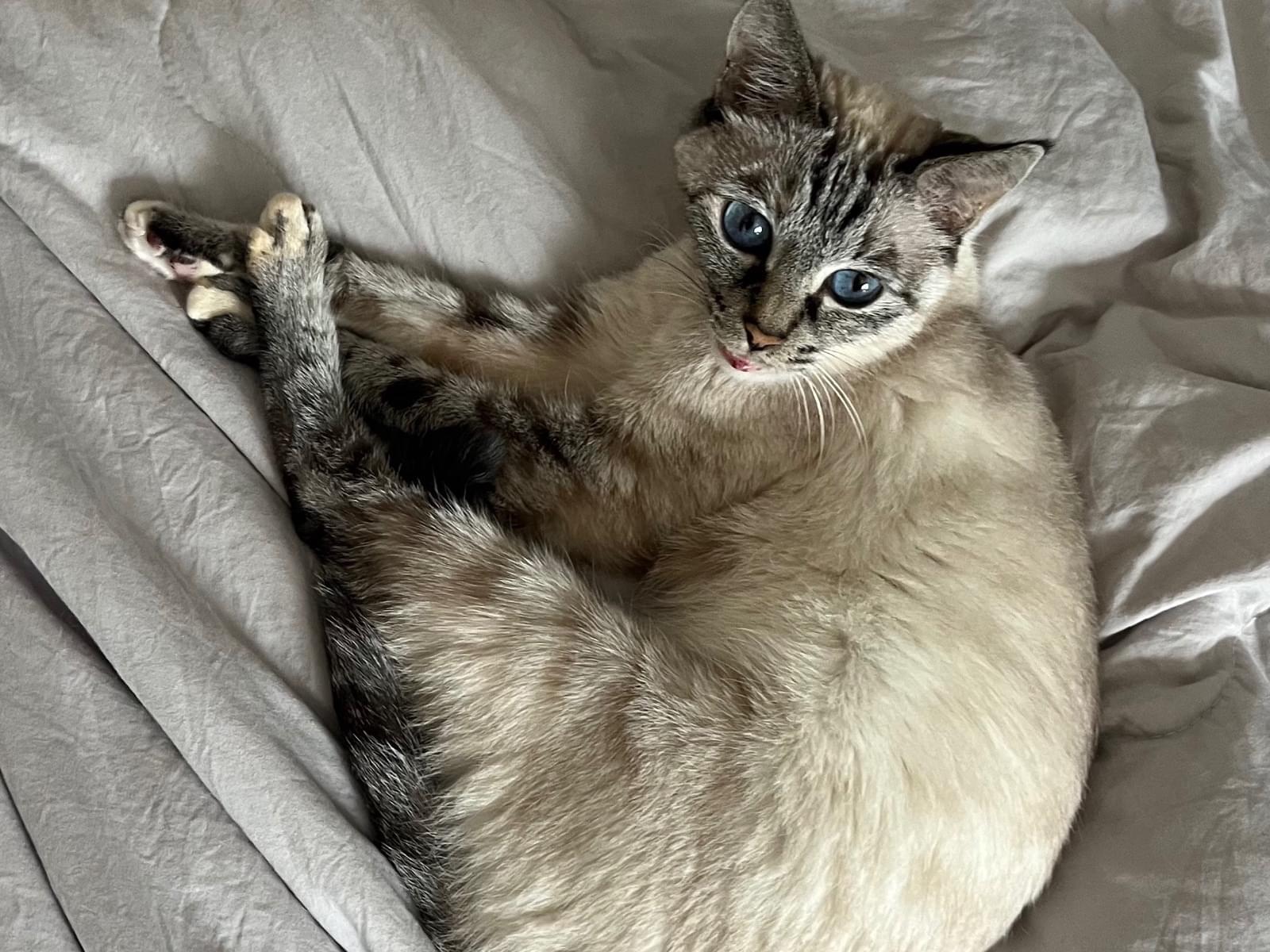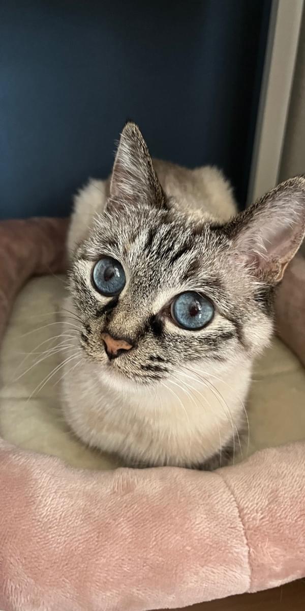 痩せ型、大きめの青い目、お顔と足、尻尾がしましまのシャムトラミックスです。