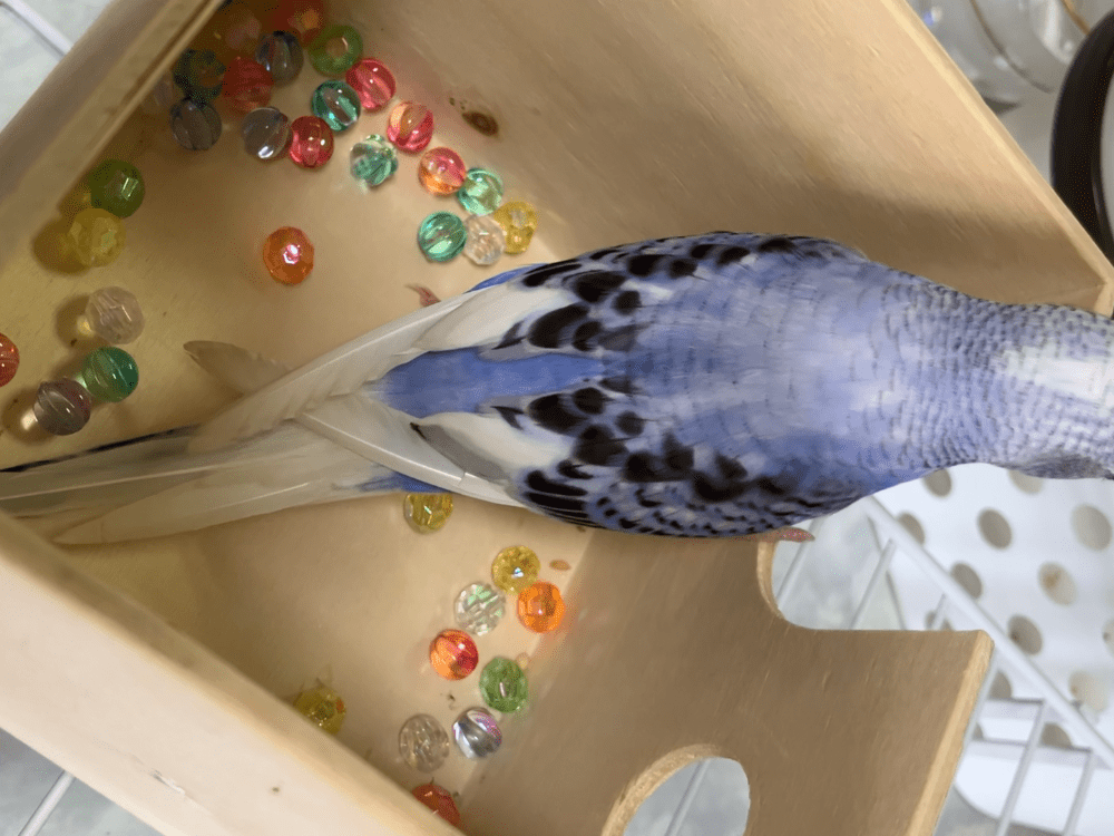 特徴は 全体的に白い羽根に、青、水色、濃紺、黒などの羽根が混ざった色合いです尾羽の白い羽根の中に 一本 黒(濃紺)の羽根があります