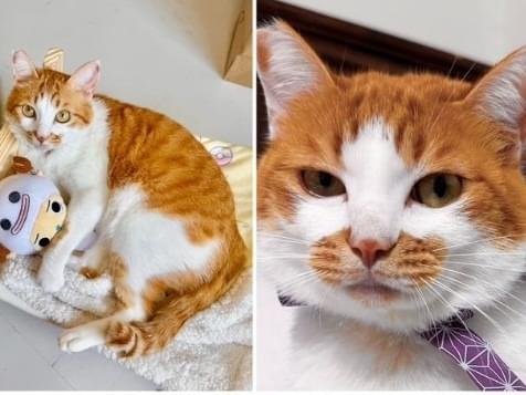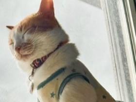 助けてください!赤い首輪と白に青い星がいくつも付いた洋服を着たオレンジと白の男の子猫を探しています。