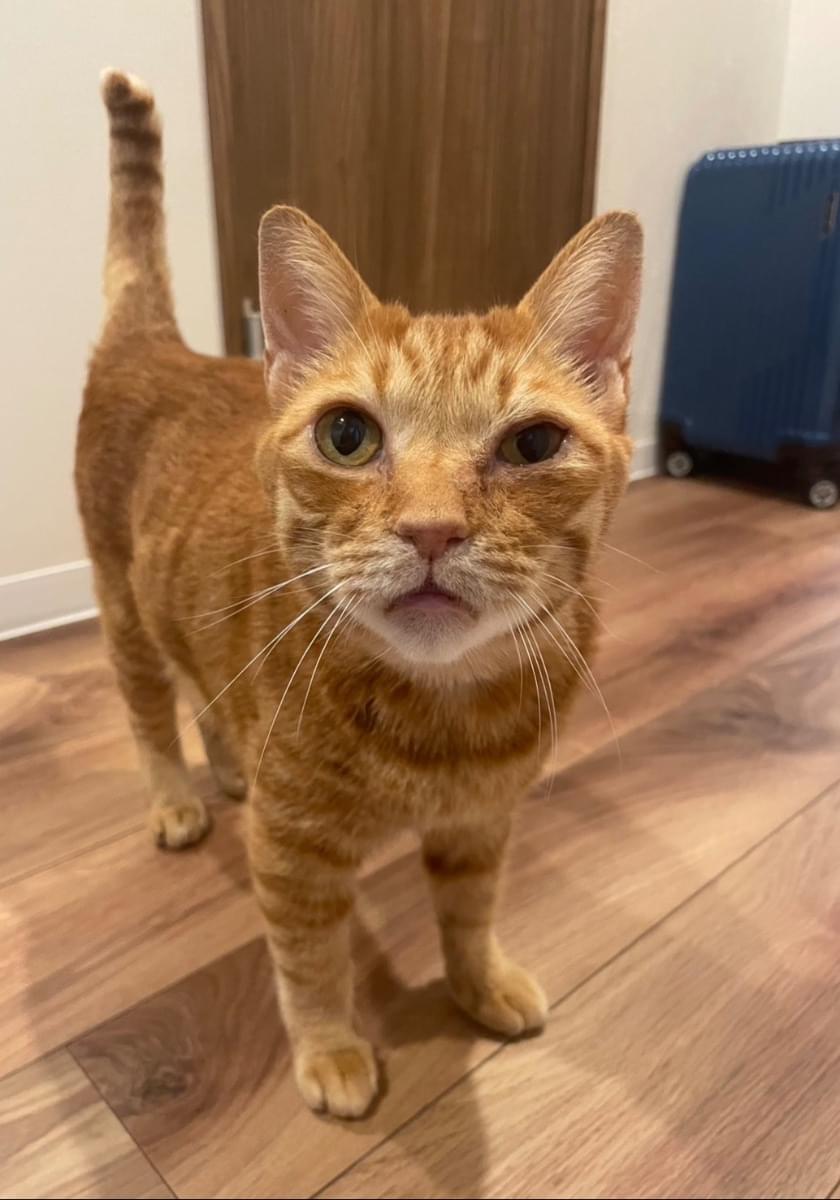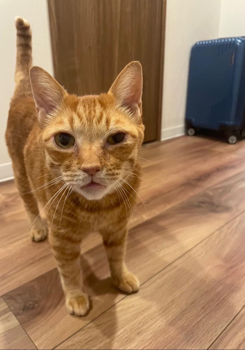 茶トラです。青とオレンジが混じった首輪してます。オス、去勢済、耳カット無しです。体重は病院で計測、5.7キロでした。前歯が2本ほどありません。