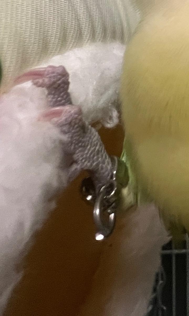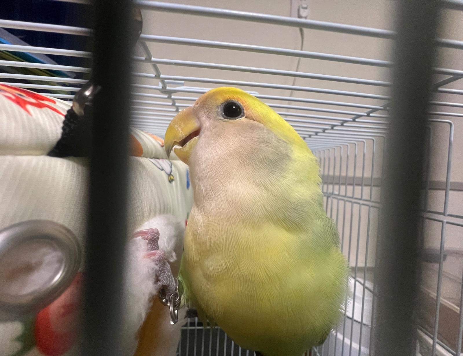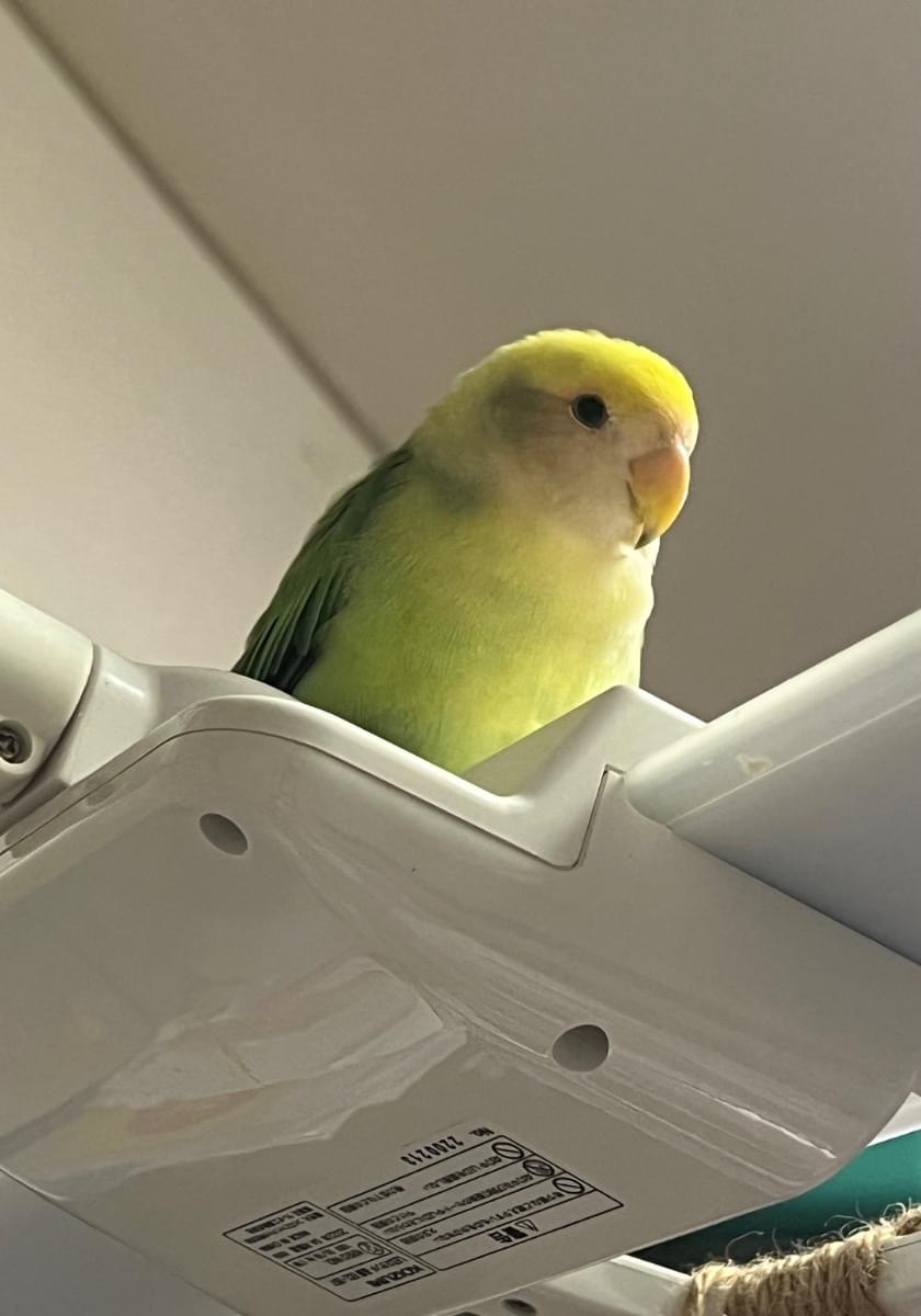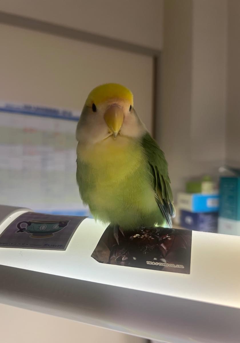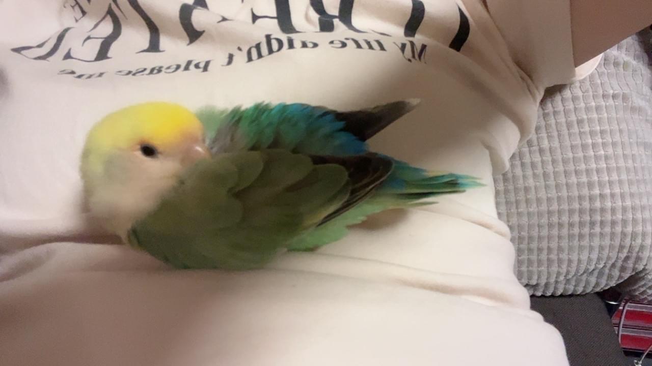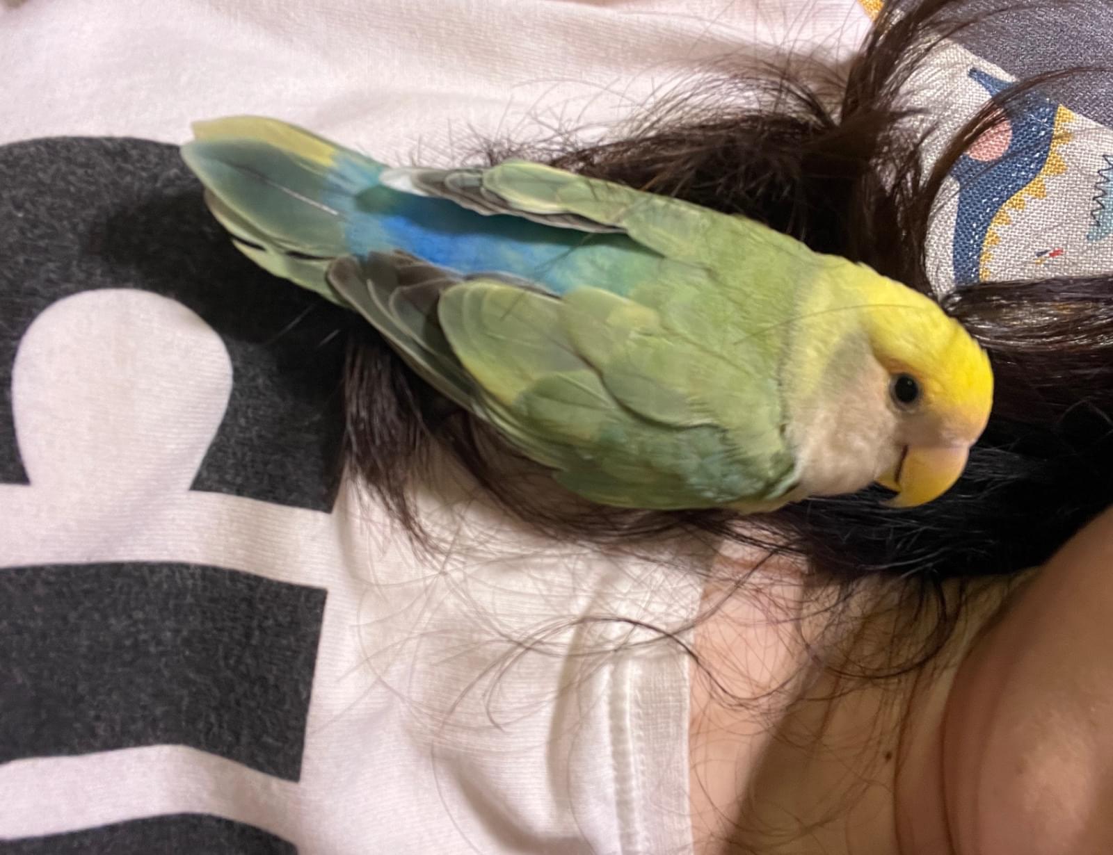 胸は黄緑、背中と翼は緑、尻尾は青いです。