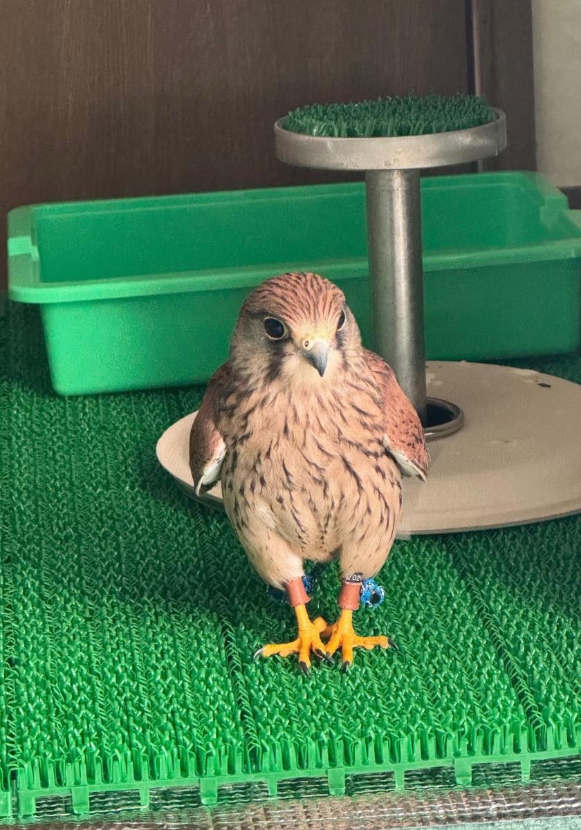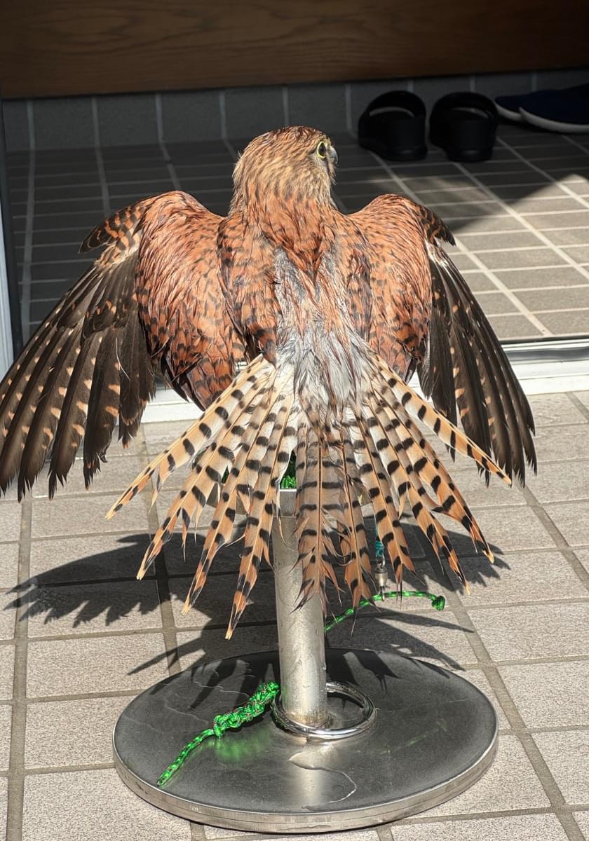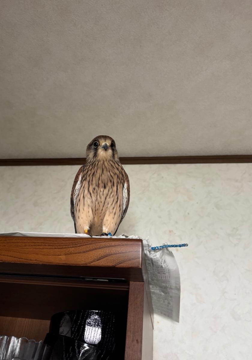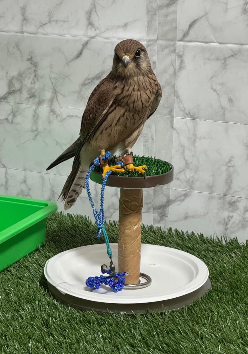 生後3ヶ月のチョウゲンボウを探してます。まだ性別は分かりません。全体的に茶色で黒の斑ら模様になっています。頭から尾まで30センチ、体重は178gです。鳩くらいの大きさでオカメインコよりちょっと大きいくらいです。青色のジェスをはめています。