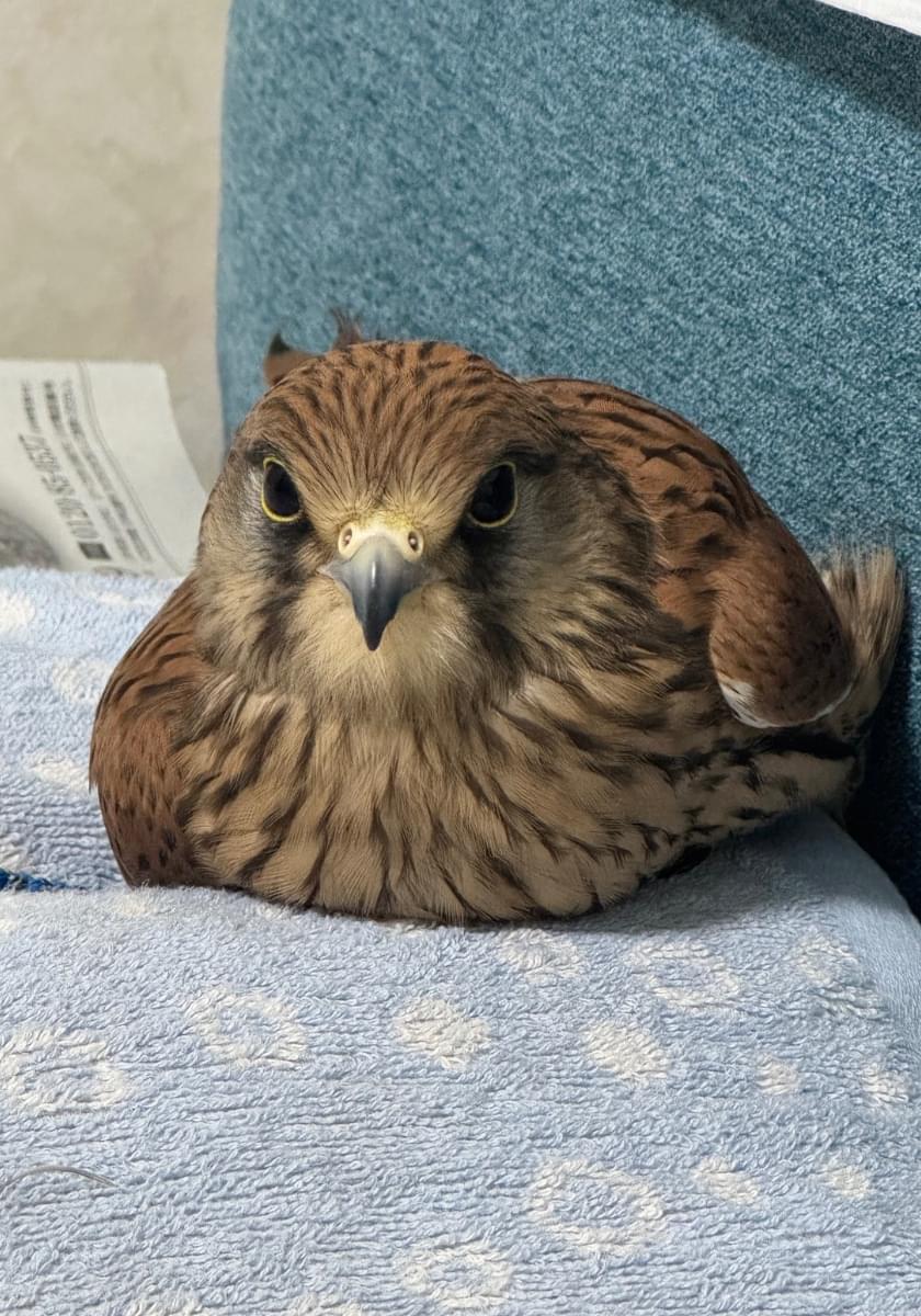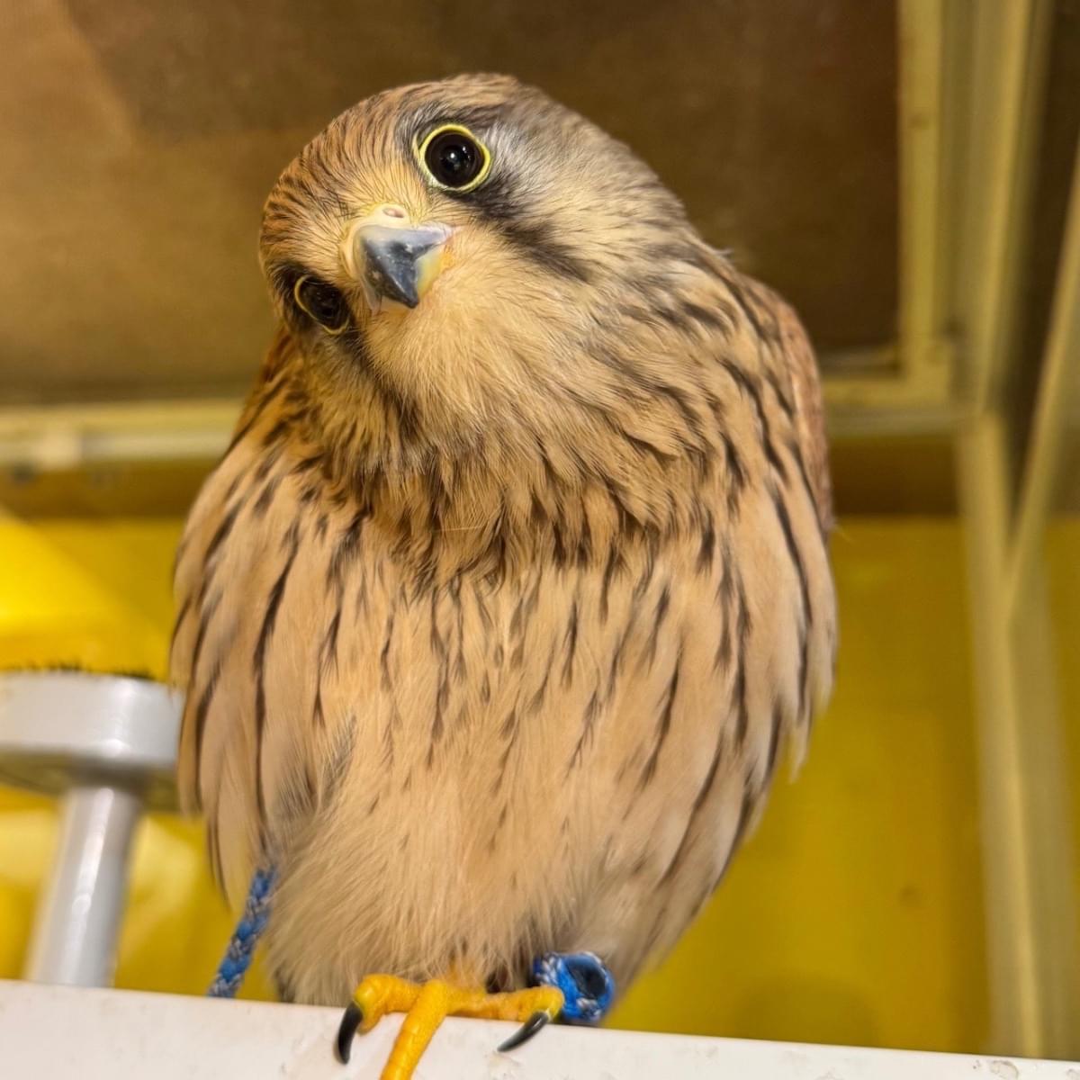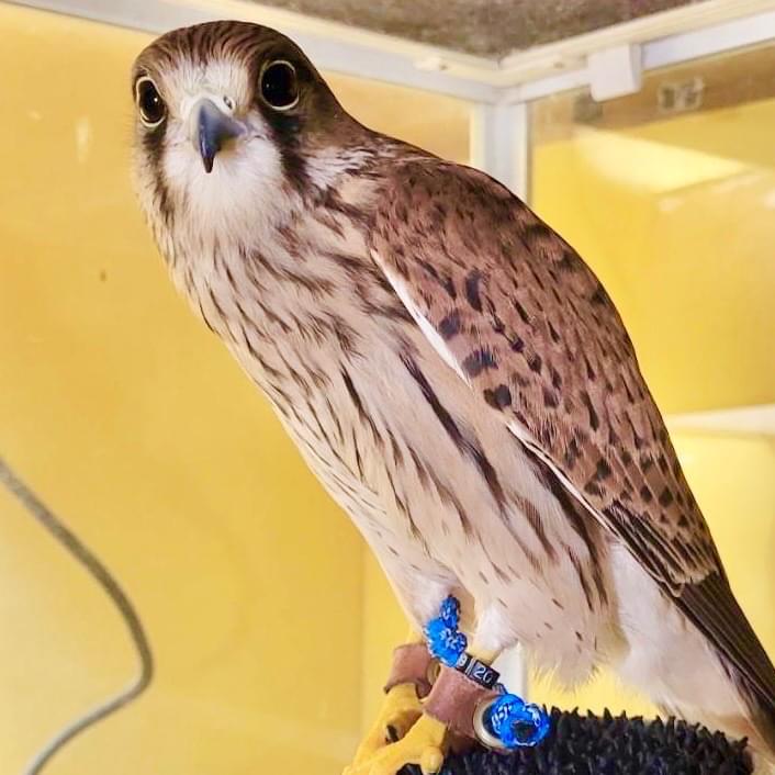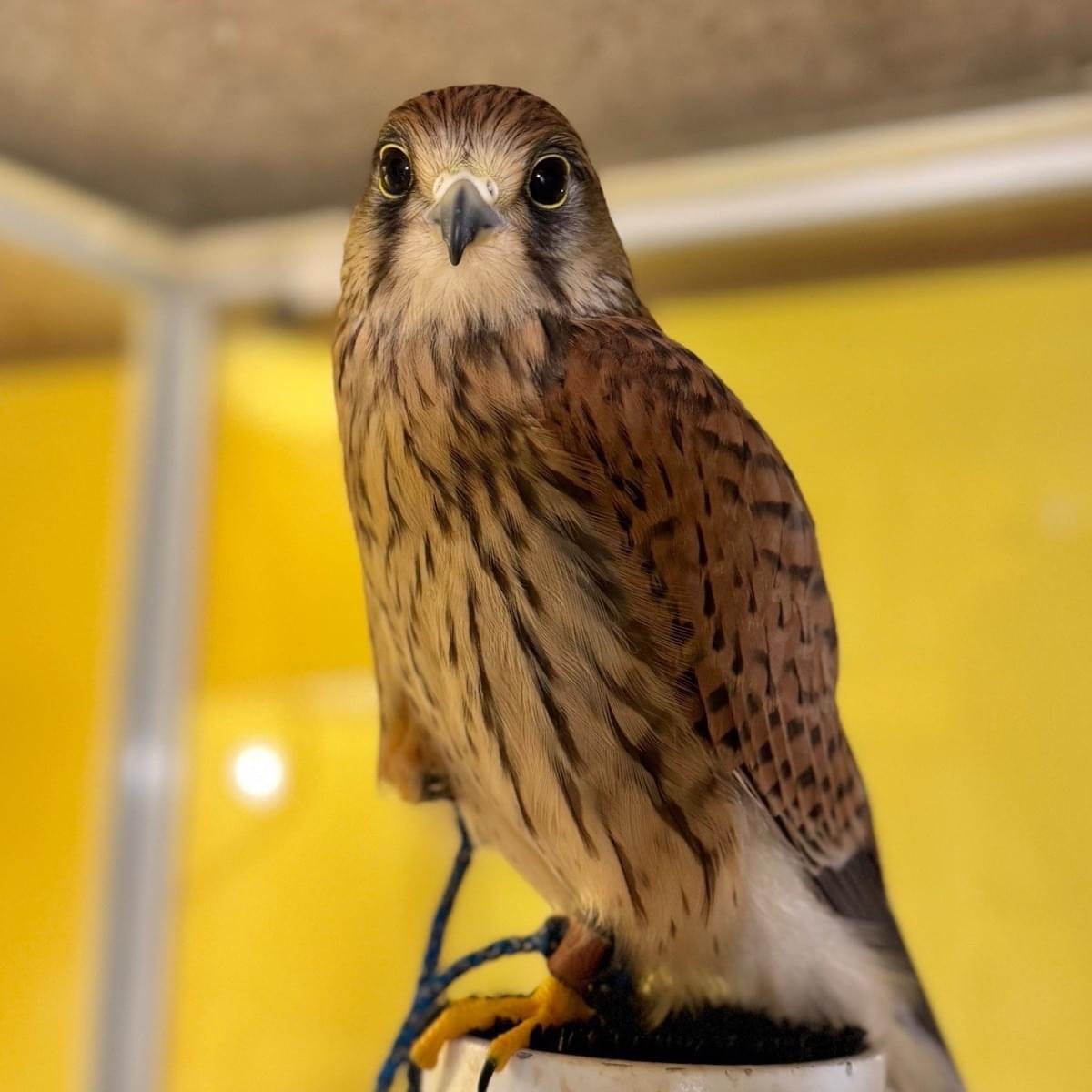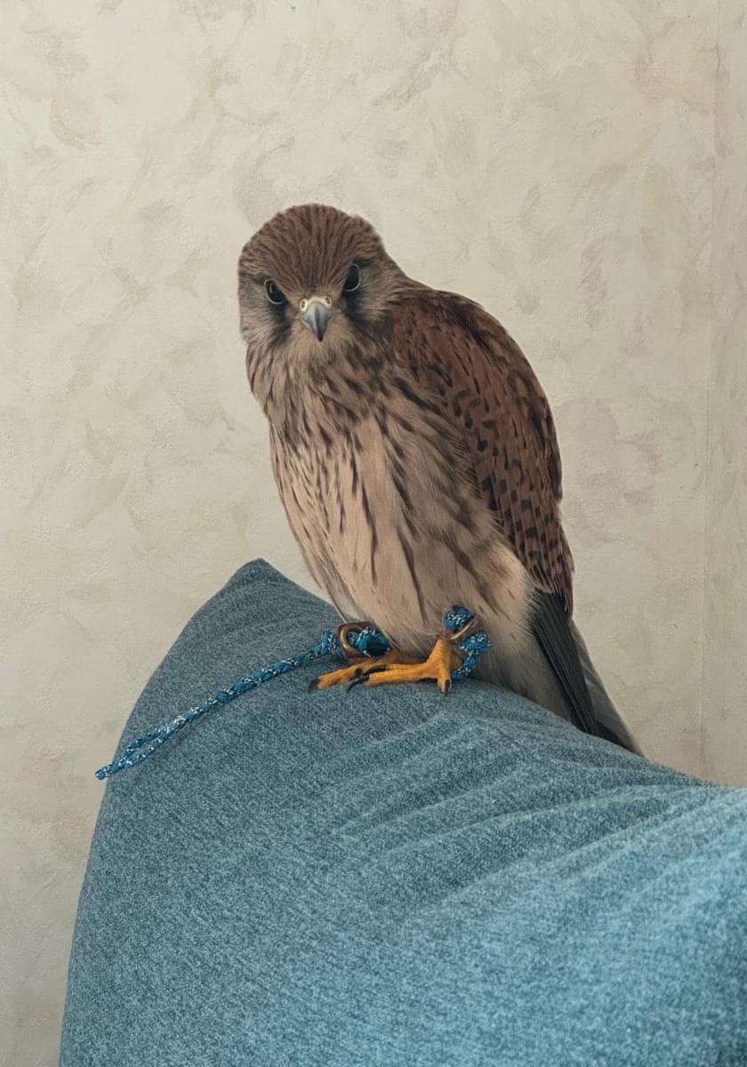 生後3ヶ月のチョウゲンボウを探してます。まだ性別は分かりません。全体的に茶色で黒の斑ら模様になっています。頭から尾まで30センチ、体重は178gです。鳩くらいの大きさでオカメインコよりちょっと大きいくらいです。青色のジェスをはめています。