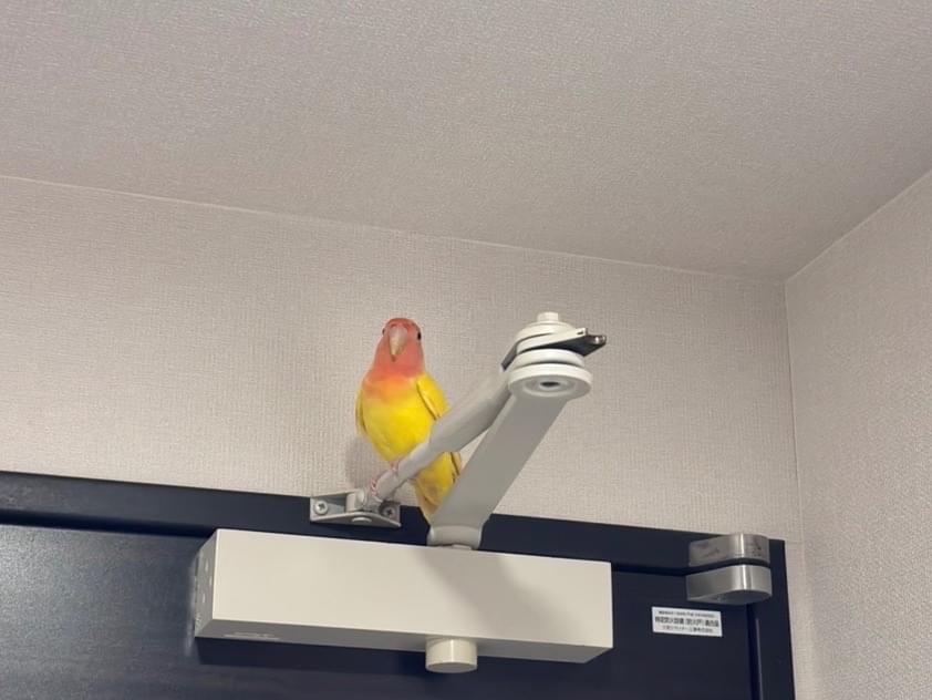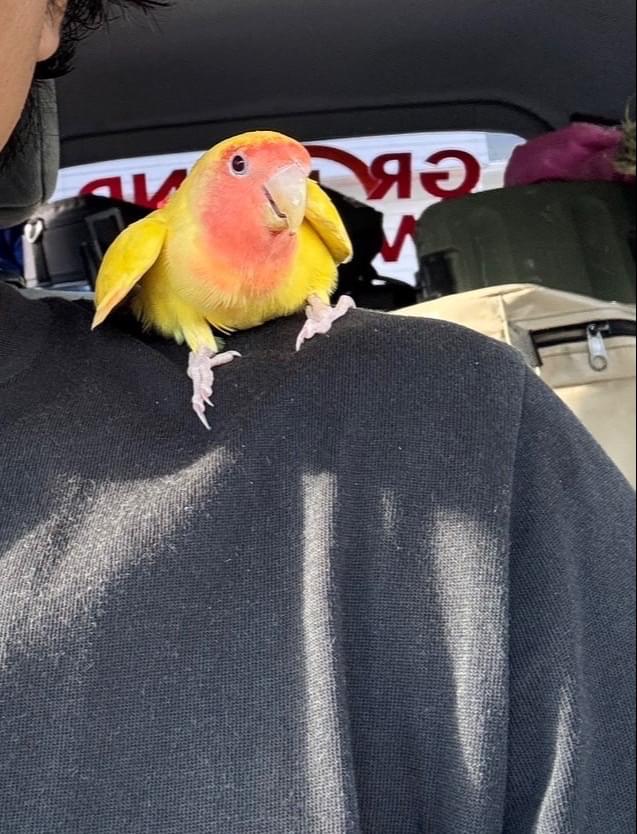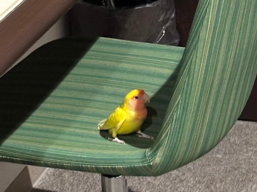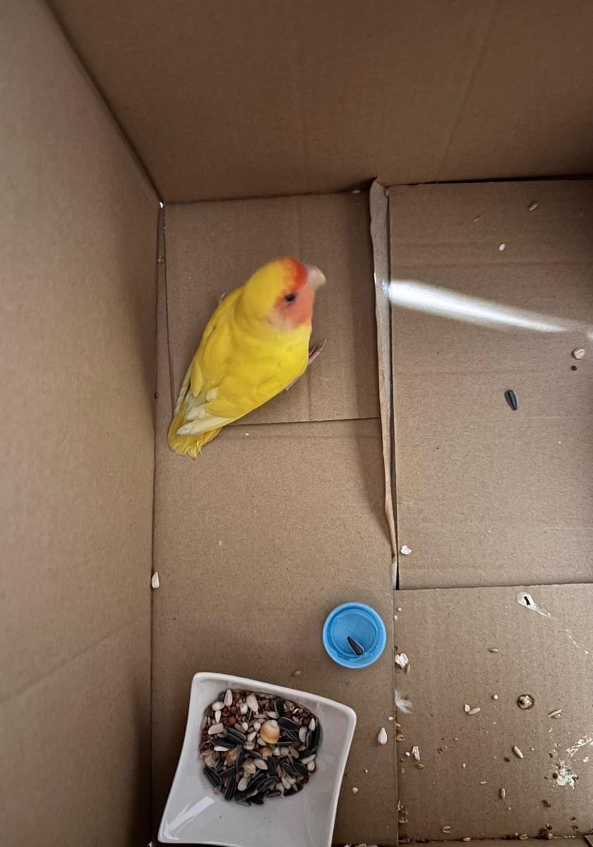 体が黄色く、顔がオレンジっぽい赤色のコザクラインコ?を保護しました。