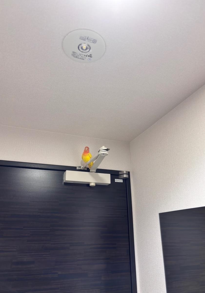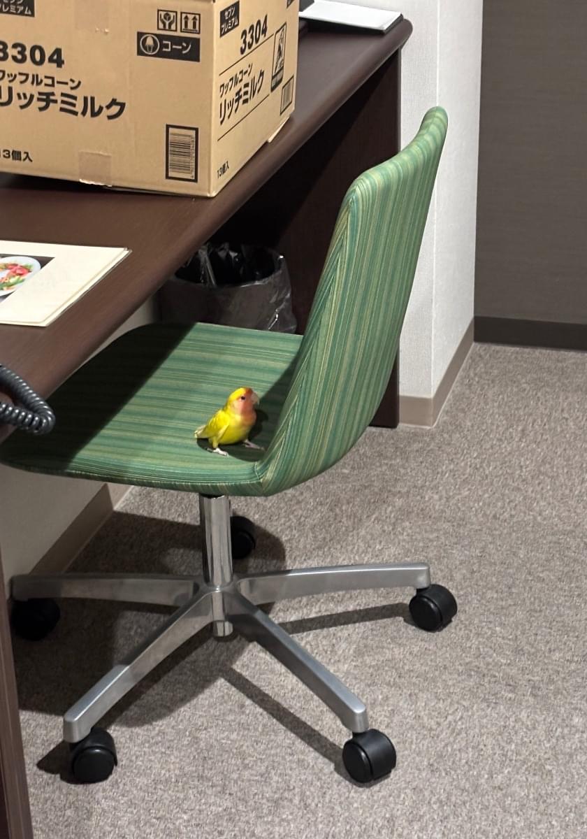 顔がオレンジ体が黄色のおそらくコザクラインコを保護しました