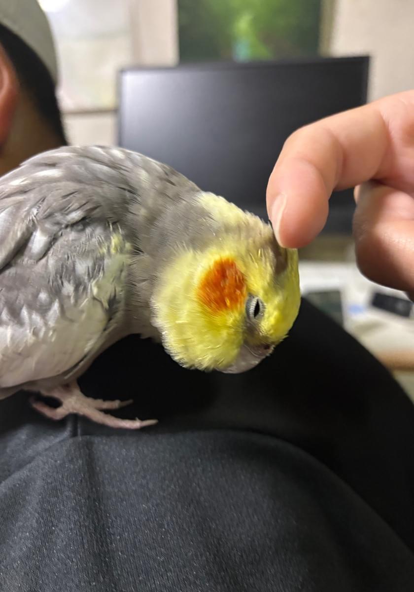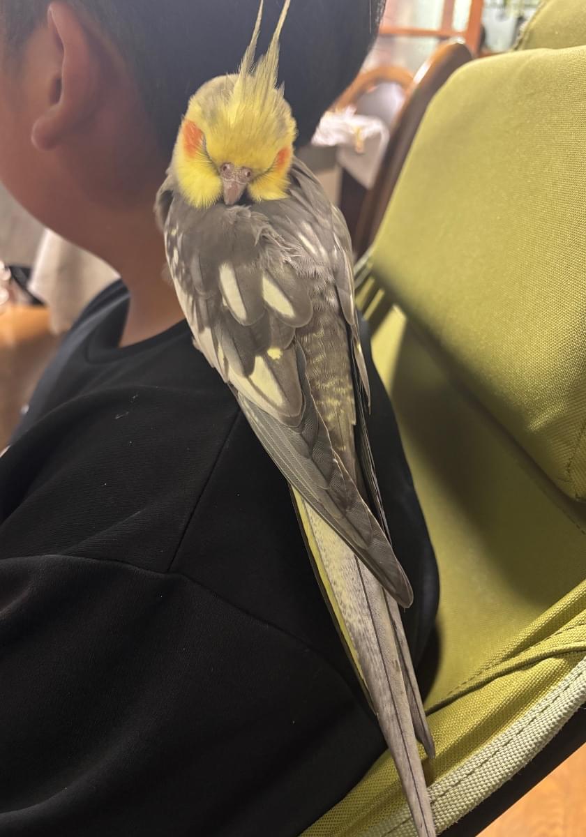 人に慣れているようで、近くで手を伸ばしたら手に乗り、そのあとすぐに肩に乗ってくれました。