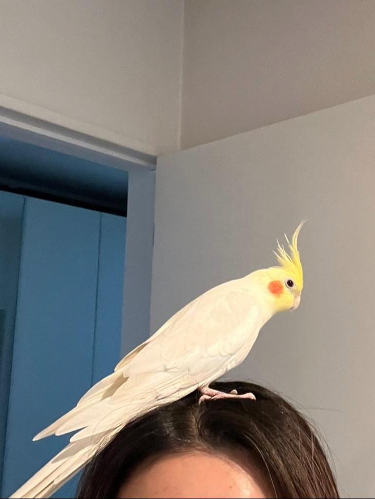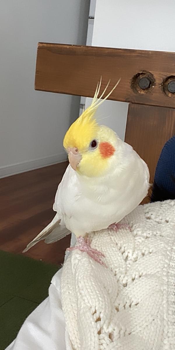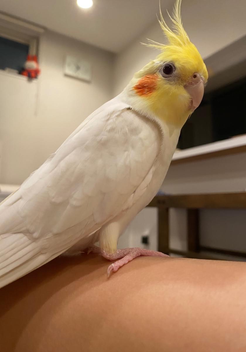 ルチノー(頭と冠羽が黄色、身体が白、ほっぺがオレンジ)です。