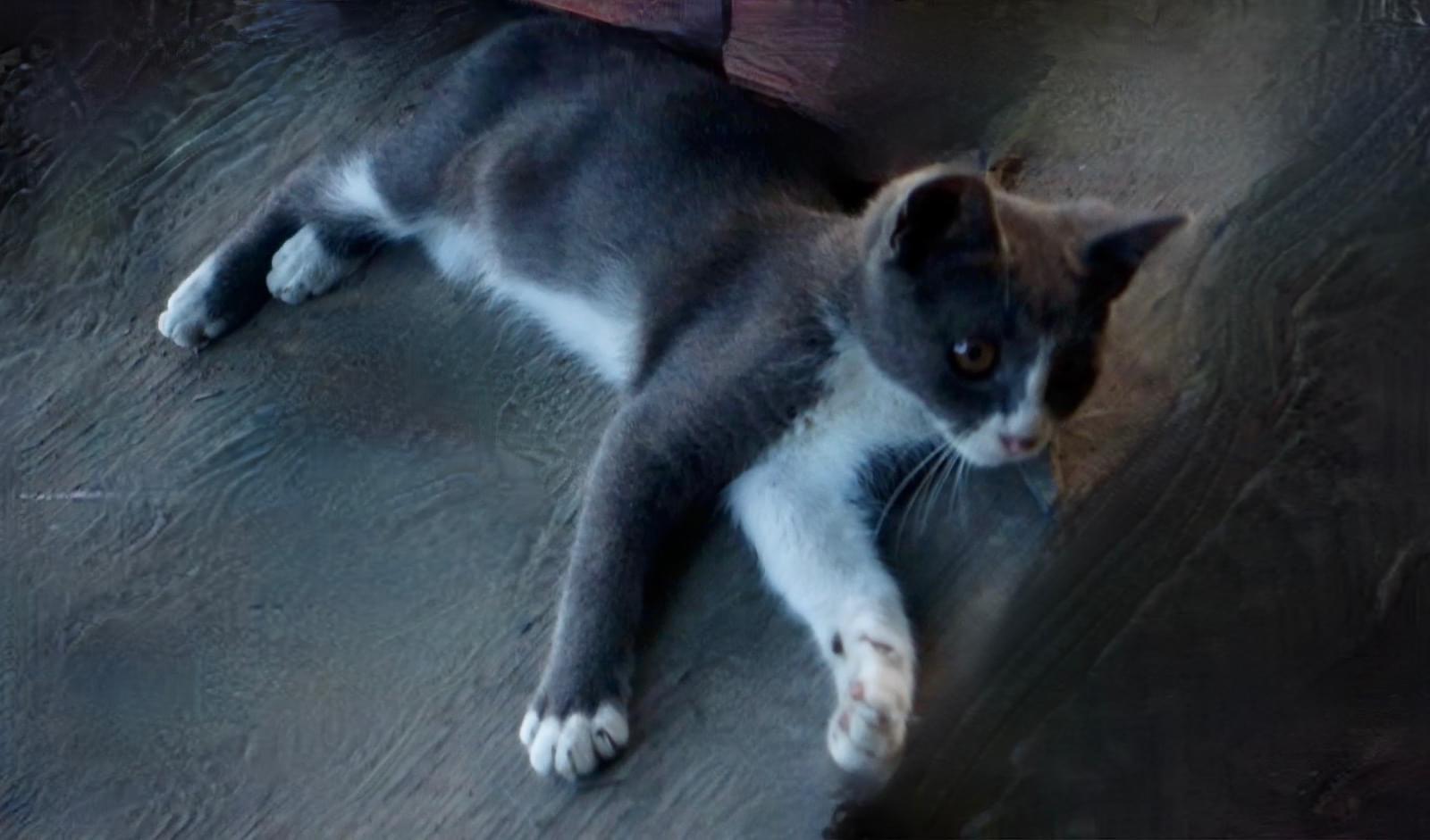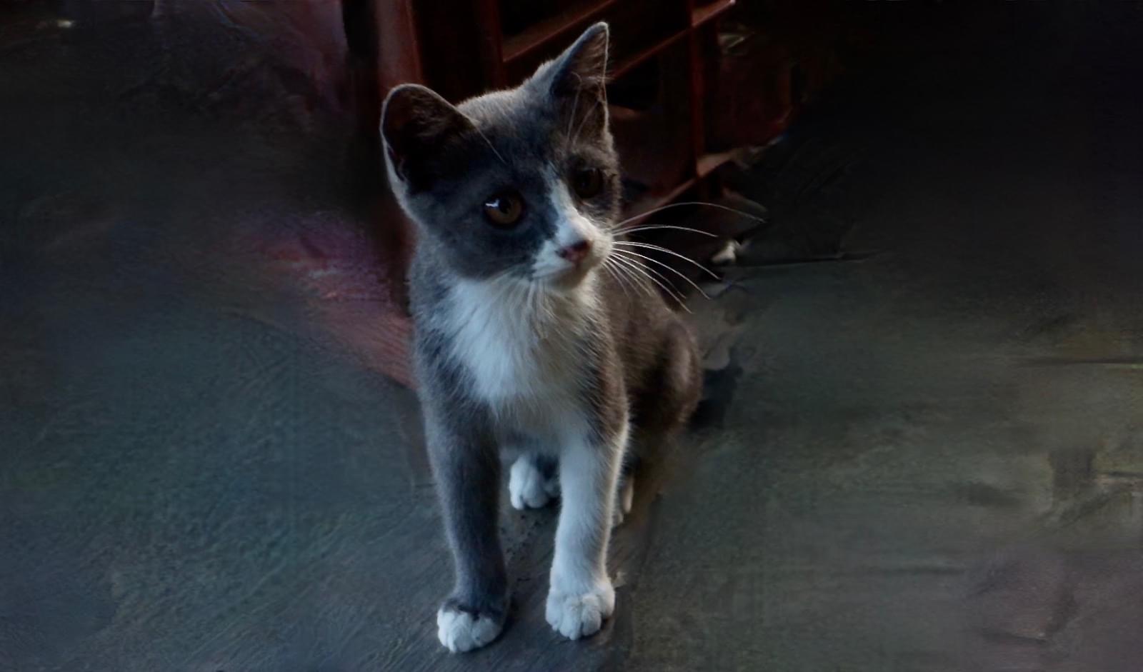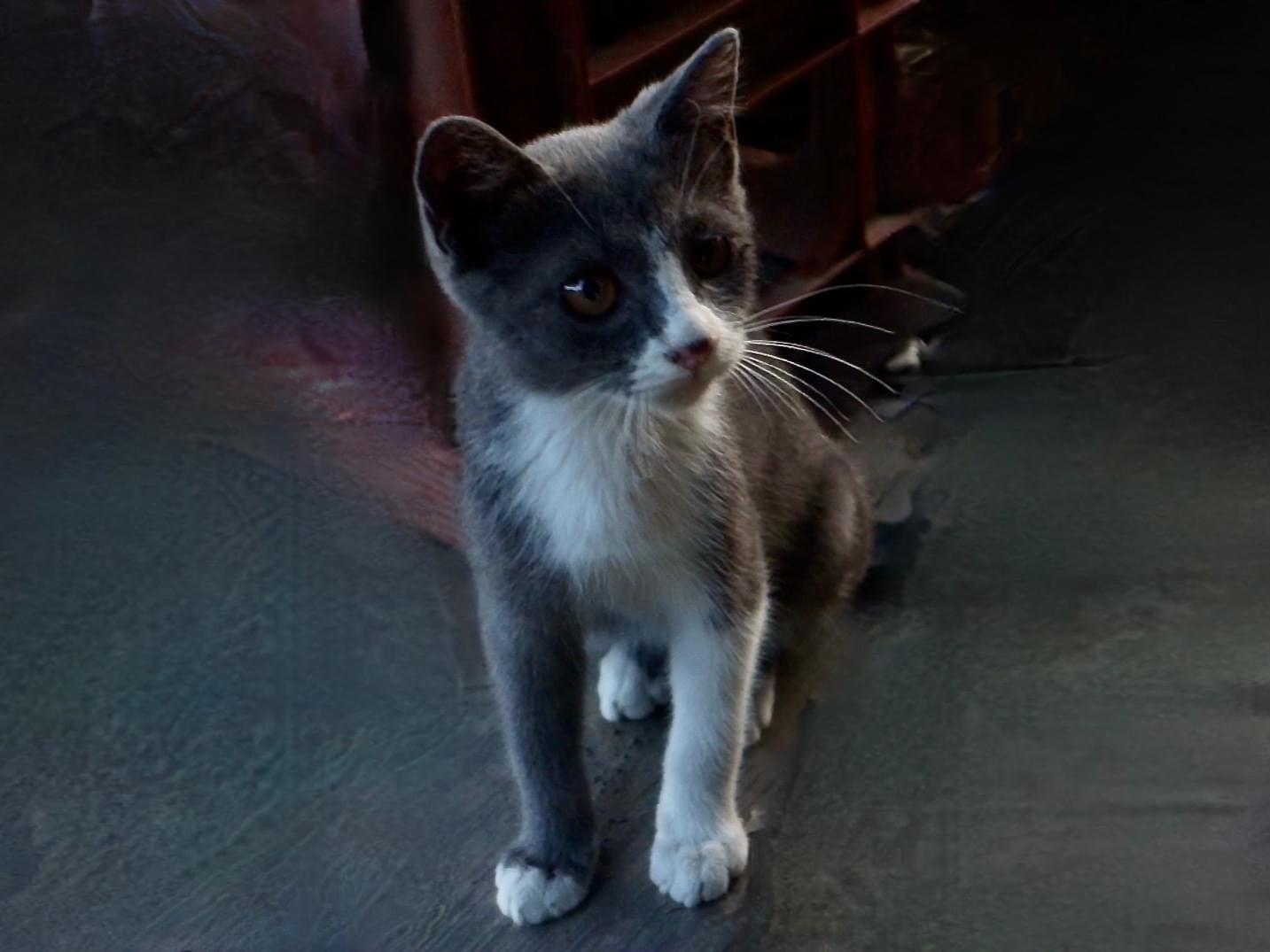 右手(右前足)が灰色、左手(左前足)は白色です。顔は灰色のハチワレです。よく人に慣れた子猫です。