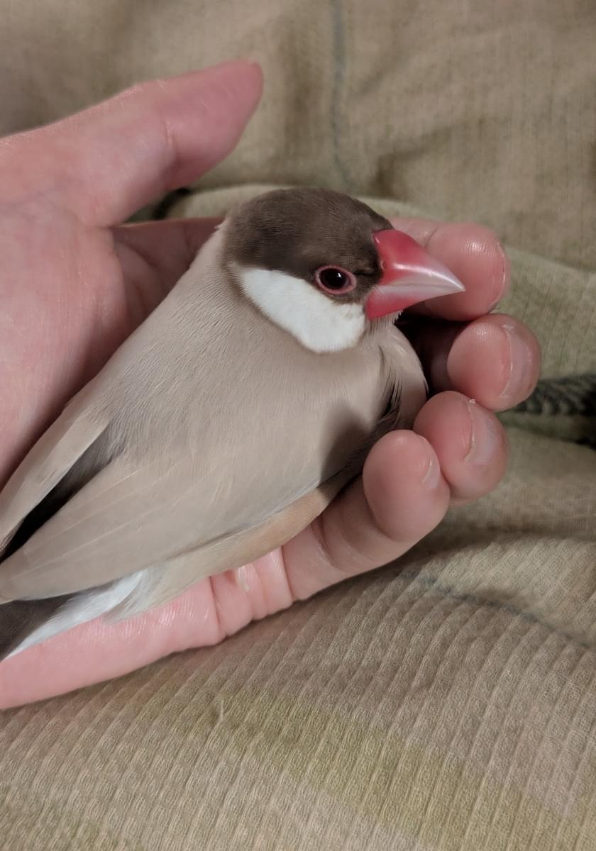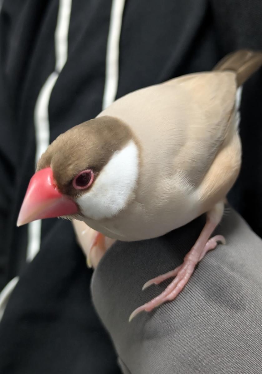 頭は焦げ茶、白い頬、瞳は暗い赤色、羽はアイボリーのような色でお腹が薄茶です。