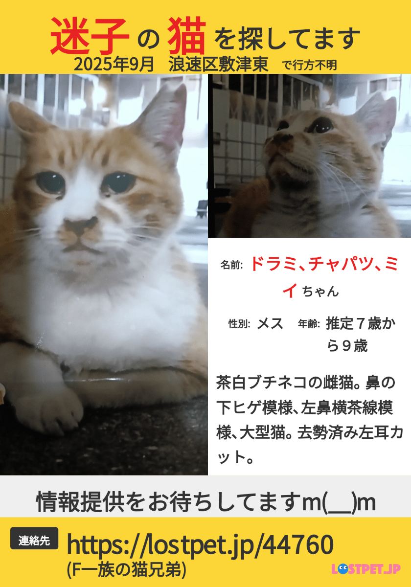 長年浪速区敷津東にある敷津小学校付近のガレージで可愛がられてた茶白の地域猫雌が9月17日最後に行方不明になりました。名前をよんでも出てこずガレージ周辺いろんな場所を探しましたがまったく見つかりません。すごく心配してます。区役所保健所に問い合わせしましたが、該当する猫はいないとの事です。特徴は左耳去勢カット済み、鼻の下にヒゲ模様、左鼻横に約2センチ程の茶線模様、性格は少し人見知りが激しく、車の下に隠れますが、大きな声でニャアニャア鳴く元気な雌の猫ちゃんです。目撃、情報ありましたらDMしてくださったら幸いです。皆様よろしくお願いします。