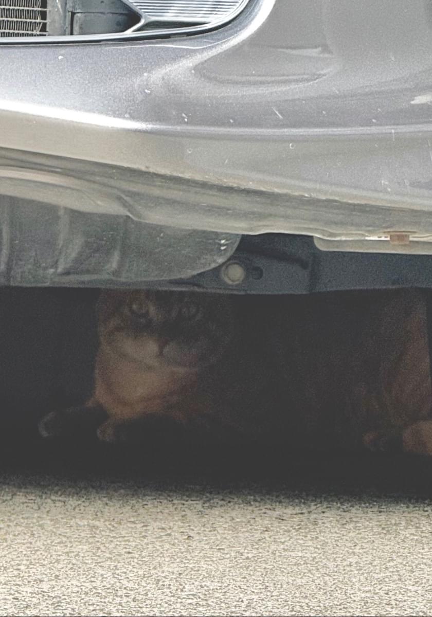 近づくとゆっくり逃げ、近くの車の下に潜ってしまいました。