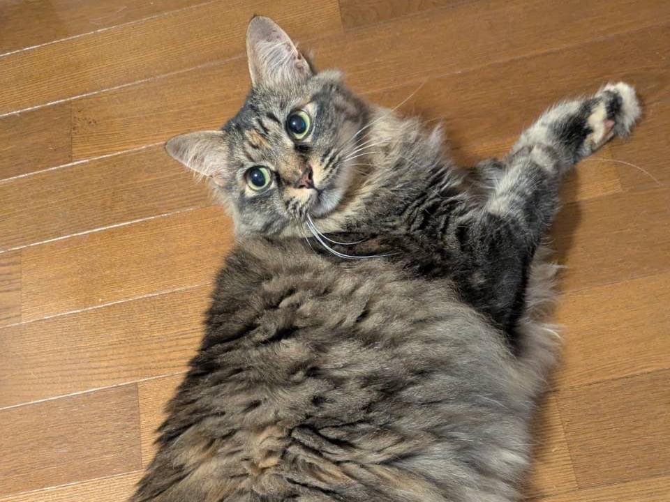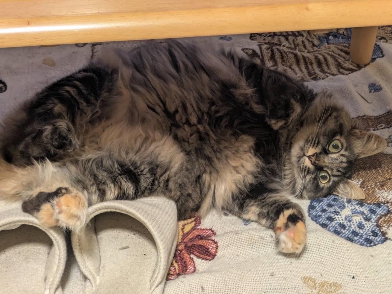 雑種の長毛種で、茶色と黒色がミックスされたトラ様の模様が入ってます。避難済みのメスです。尻尾は長くふさふさで、左足にはベージュのソックスがあります。