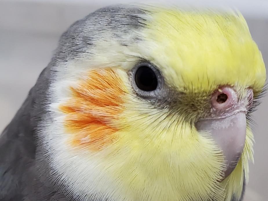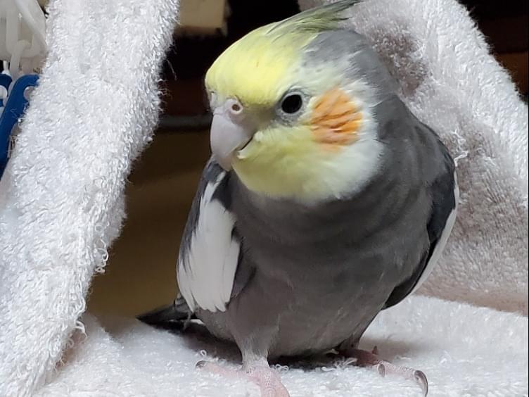身体は灰色で顔は黄色です。オカメの特徴であるほっぺはオレンジ色になります。