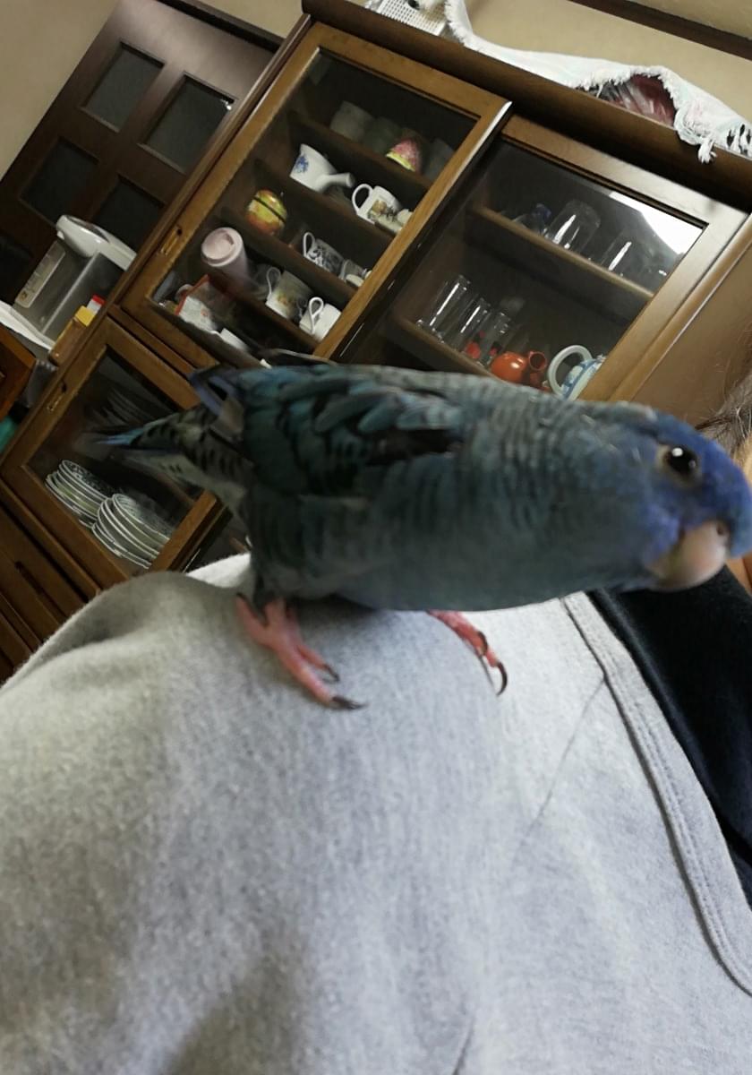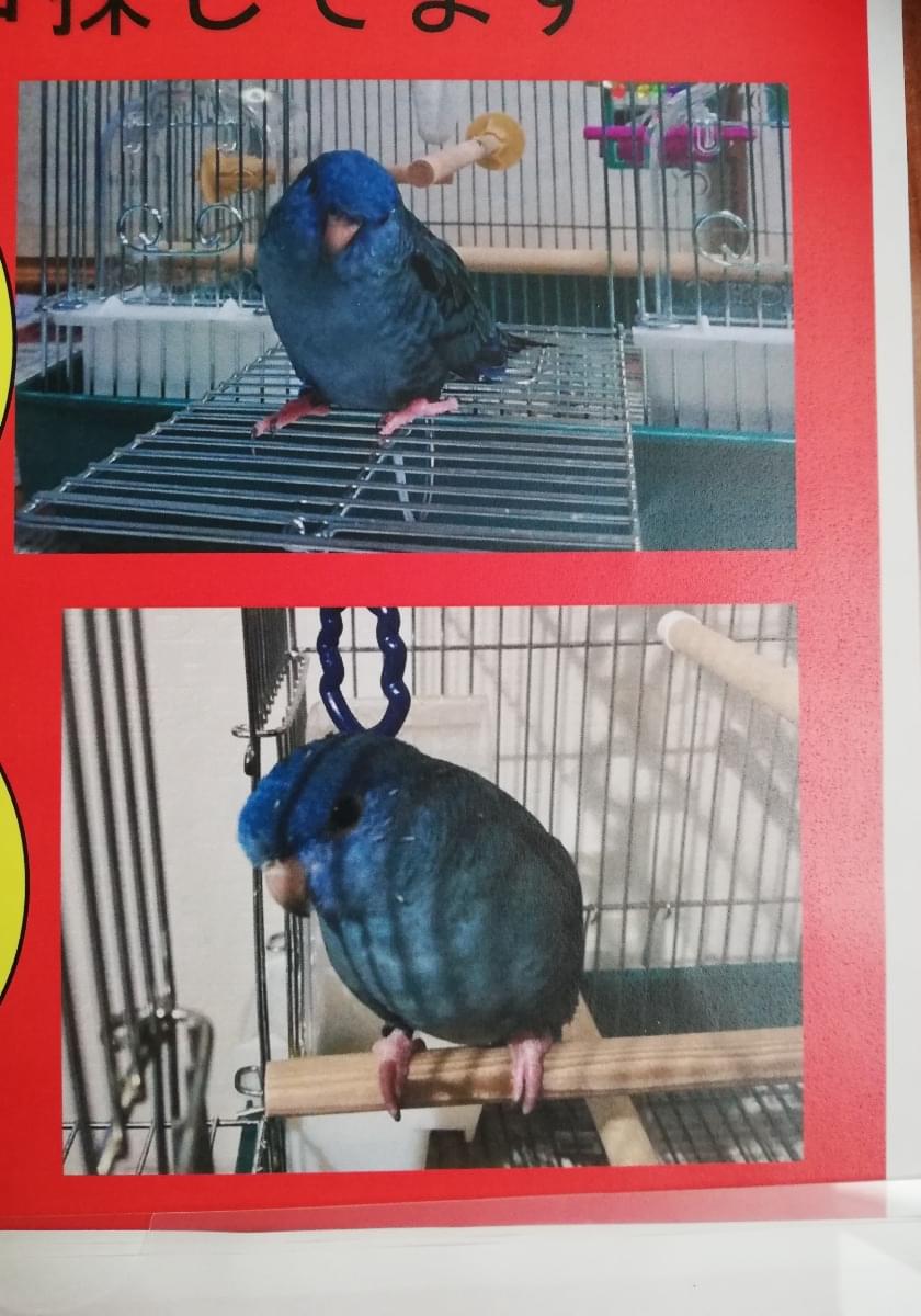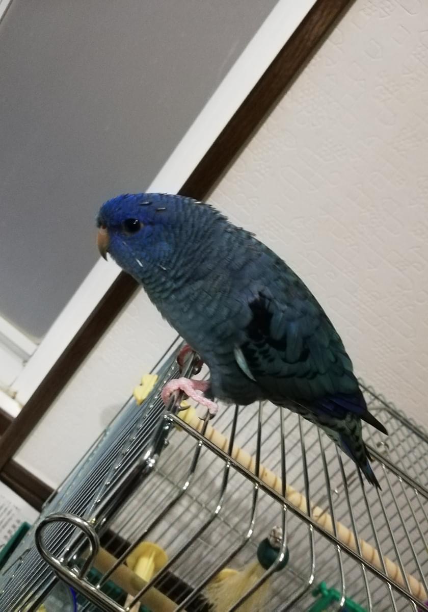 色は濃い青色に、黒い波模様があり、尾羽は短いです。ナンバー入りの足輪を付けています。