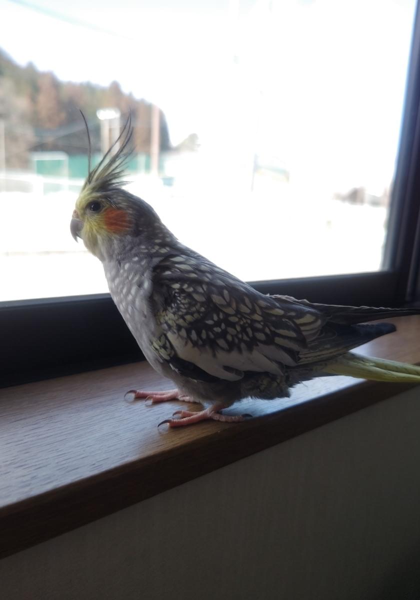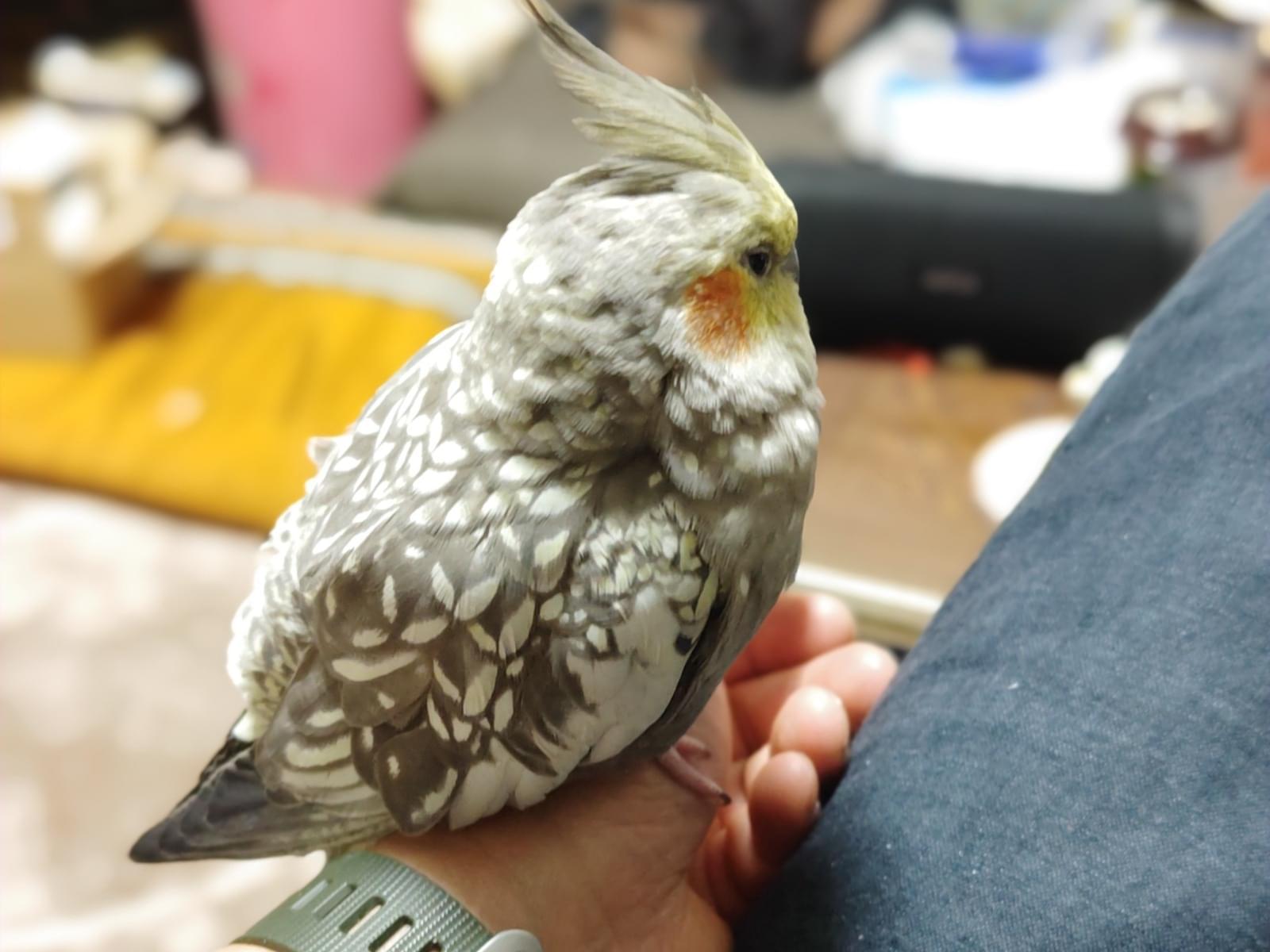 尻尾は黄色です顔はレモンイエローとグレーです冠羽はグレーほっぺたはオレンジです