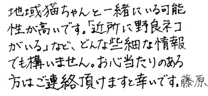 地域猫ちゃんと一緒にいる可能性が高いです。近隣で餌を与えてくださっている方がいらっしゃるかもしれません。「近所に地域猫がいる」など、どんな些細な情報でもかまいません。情報をお寄せいただけると幸いです。